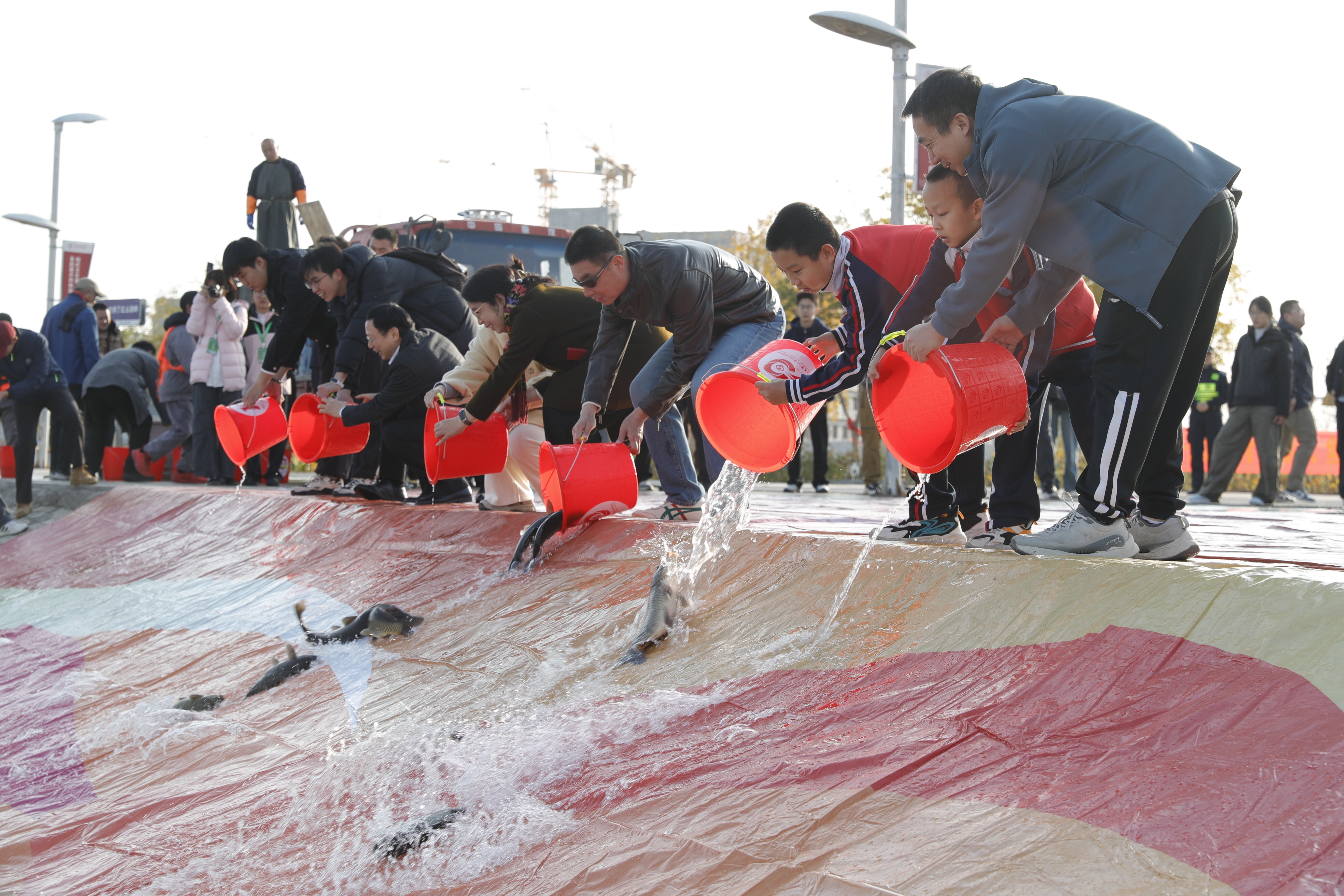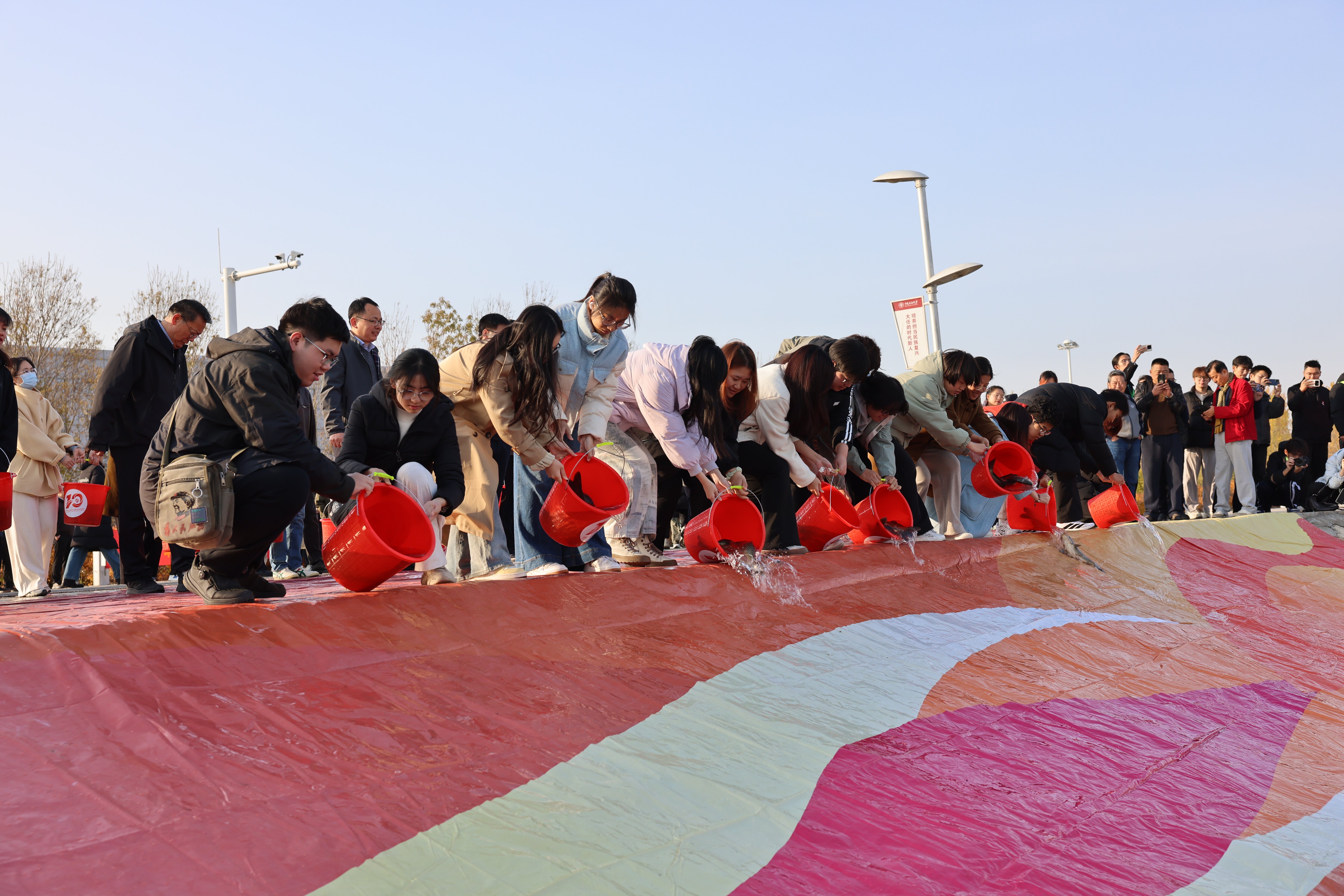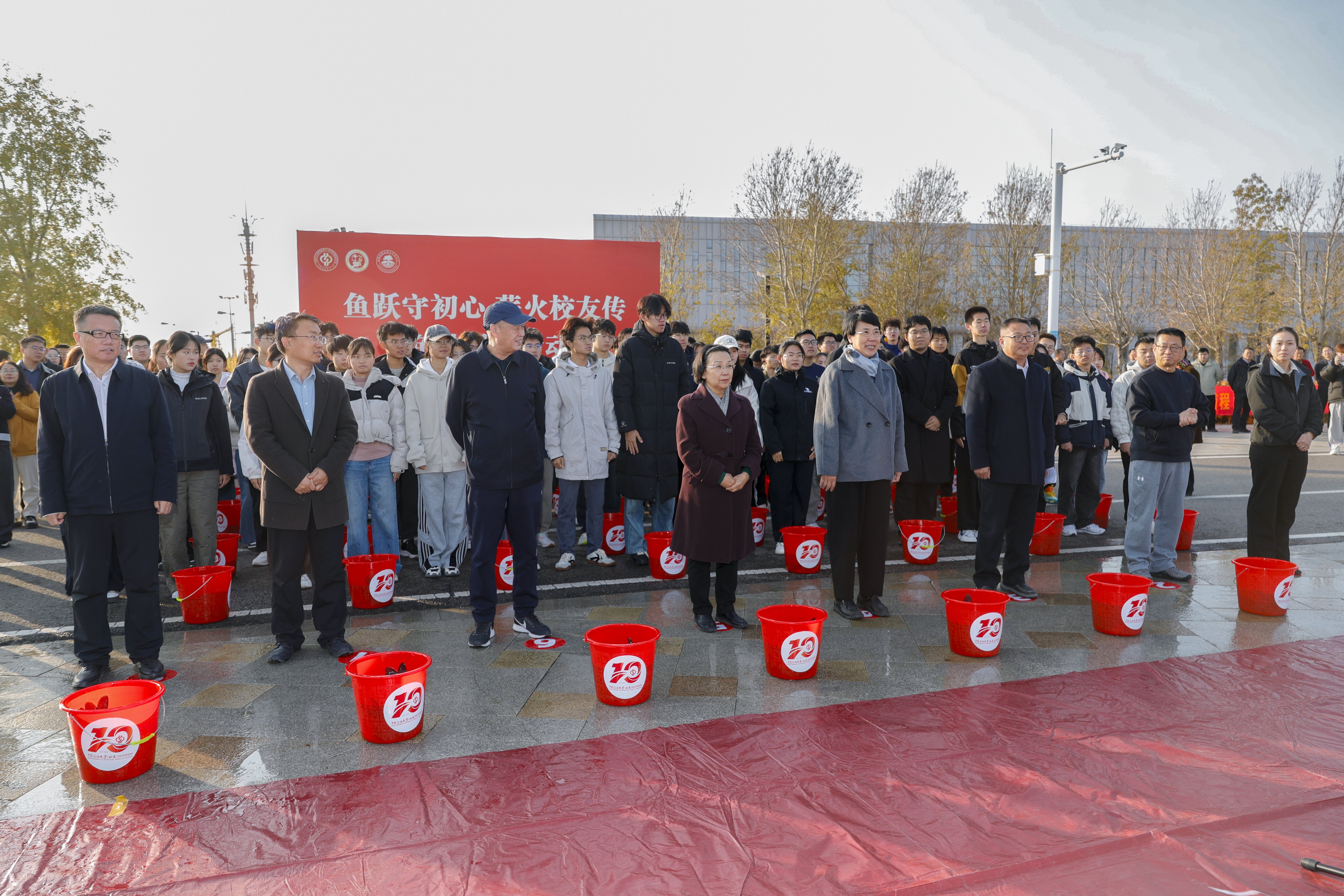随后,参加活动的师生及校友代表一同走向红山湖畔放流区域,将5000余尾鱼苗投进水中。一尾尾鱼儿跃入水面,荡开圈圈涟漪,不仅为这片精神地标注入了新的生机,更以“鱼跃人欢”的盛景,象征着中石大精神的蓬勃生机与薪火相传。