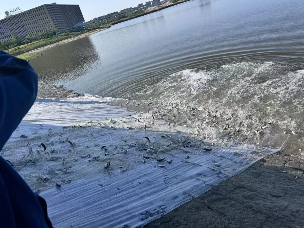 活动现场,一辆满载鲜活鱼种的运输车稳稳停靠在红山湖岸边。现场师生们接过满鱼苗的水桶,缓缓倾斜桶体,“哗啦——”清脆的水声在湖畔响起,一条条小鱼灵动欢快地从桶中跃出,尾鳍一摆便扎进水中迅速朝着湖心、芦苇丛等四面八方畅快游去,澄澈的湖面瞬间因这些小生命的加入,焕发出蓬勃生机。