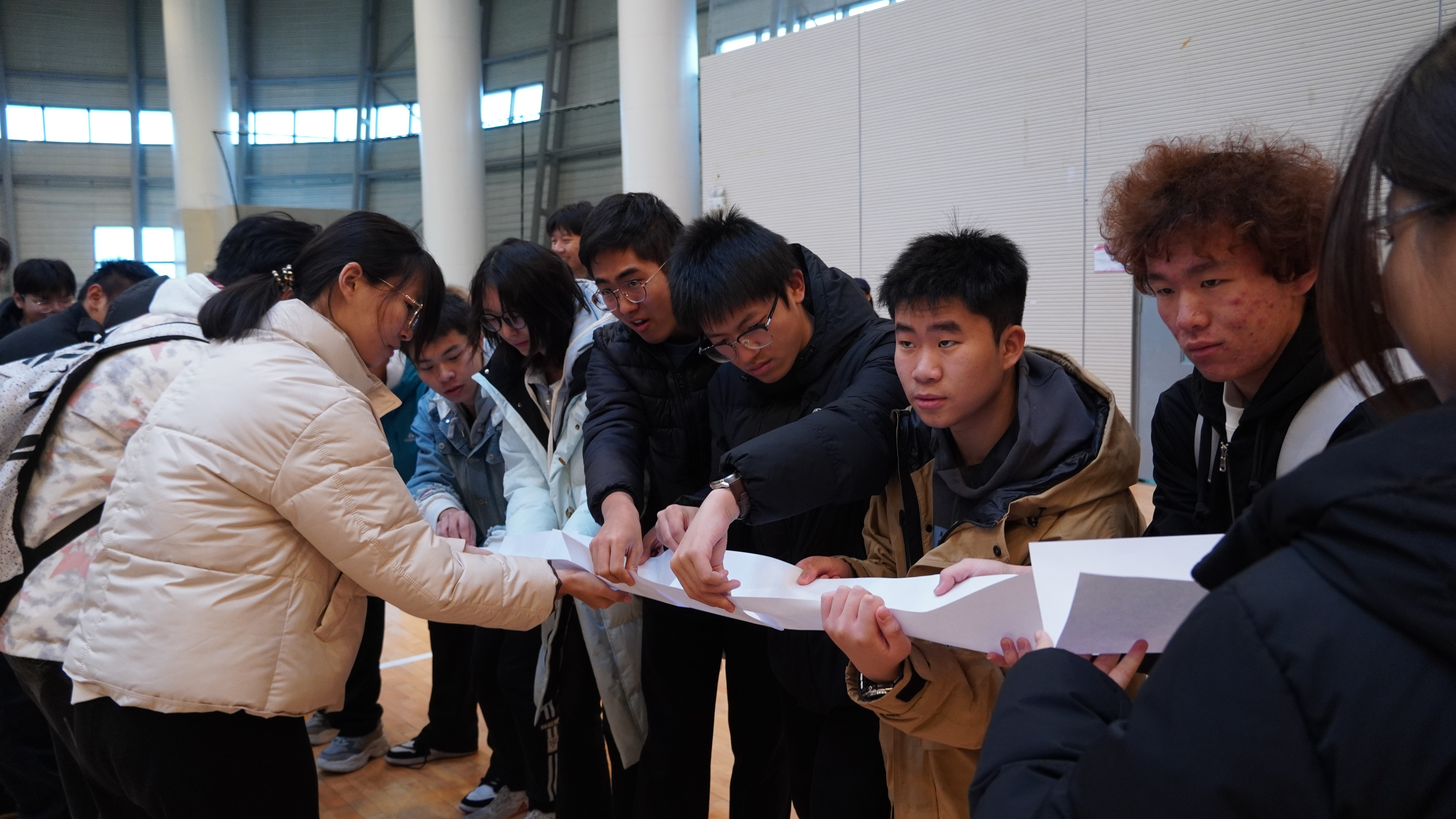 活动伊始,“珠行千里”项目率先拉开团队协作的序幕。同学们需利用A4纸搭建“运输通道”,共同护送乒乓球抵达终点。每16人集结为一组,在短暂的磨合和商讨后,各小组迅速进入状态。游戏开始后,各组队员齐心协力,配合默契,展现了非凡的团队协作精神,每个小组都圆满完成了任务。