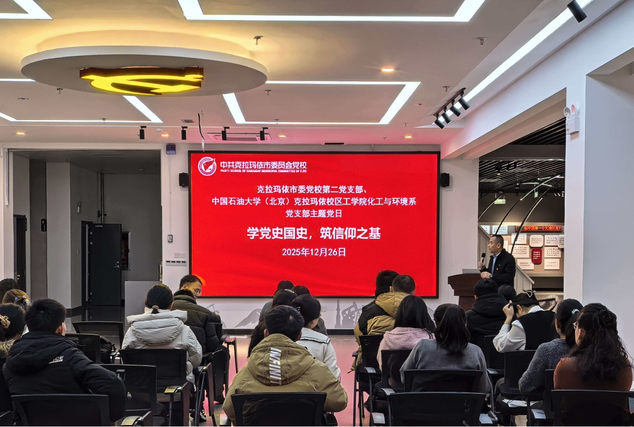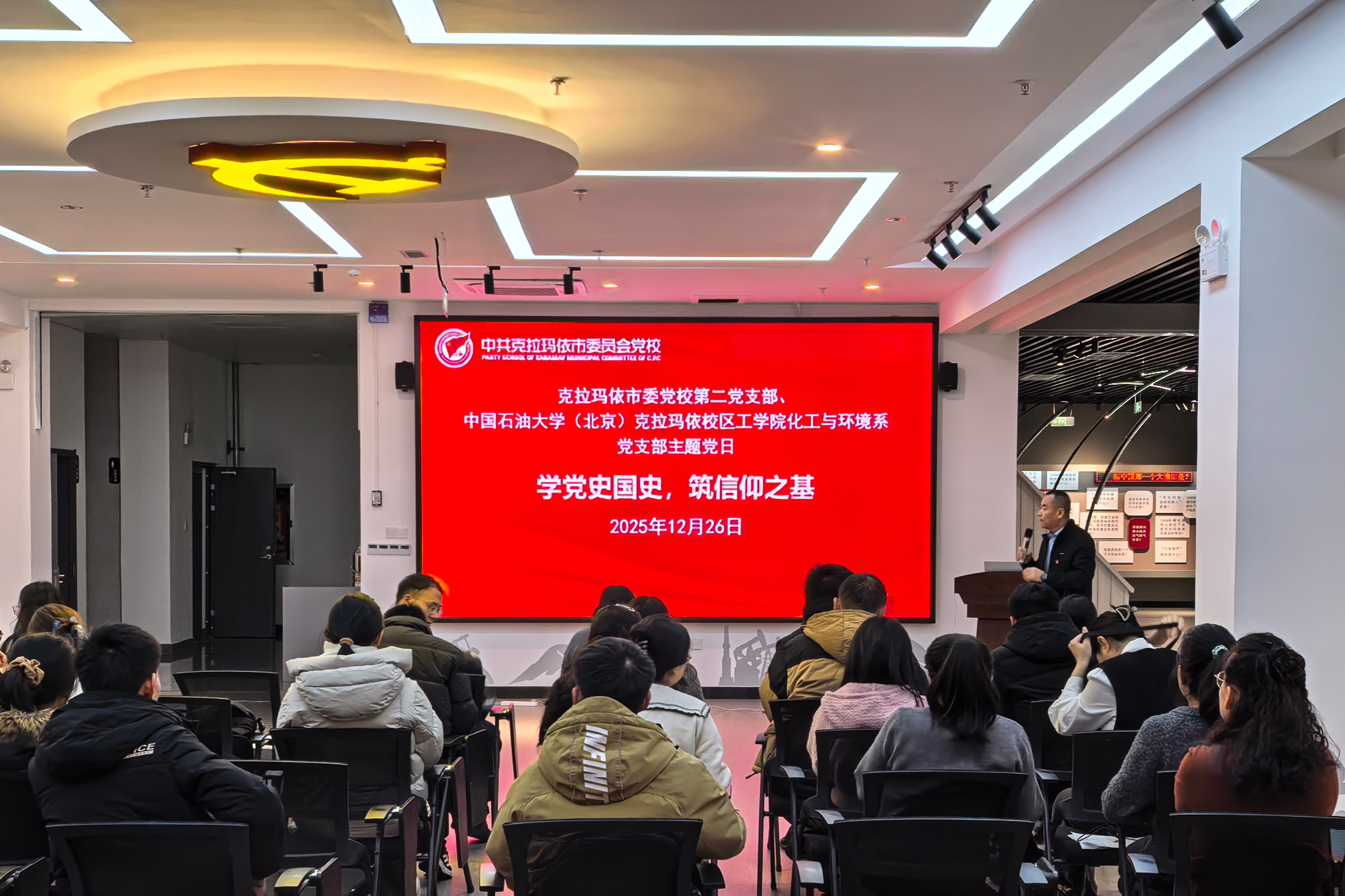 为深入学习贯彻习近平新时代中国特色社会主义思想,巩固拓展党史学习教育成果,深化中华民族共同体意识,12月26日,市委党校第二党支部与工学院化工与环境系党支部联合在市委党校泽汇楼克拉玛依石油精神主题教室开展“党旗映天山”主题党日活动。两个支部的党员干部、群众代表齐聚一堂,在红色教育氛围中接受思想洗礼,凝聚奋进力量。