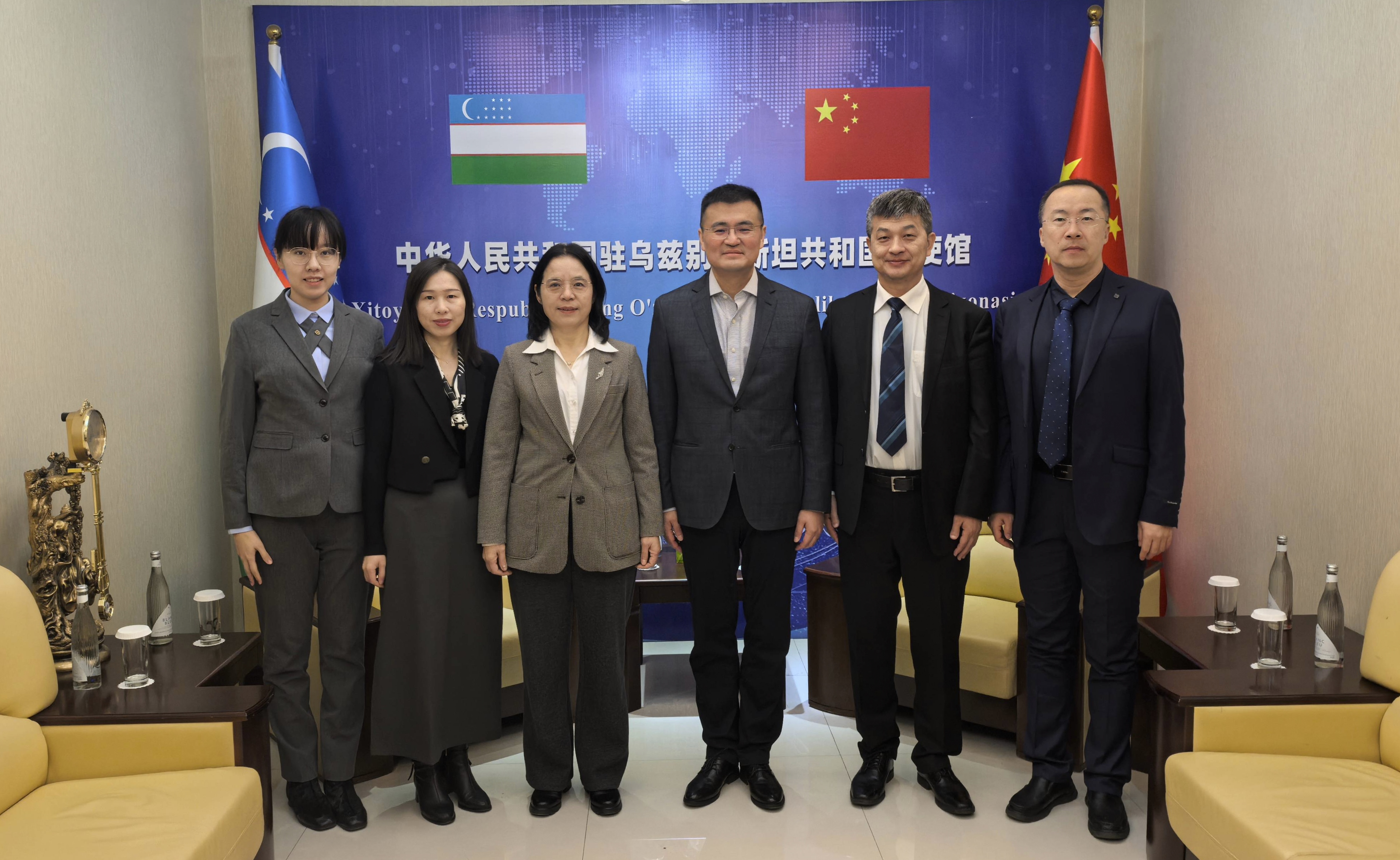 代表团一行分别与中国驻乌兹别克斯坦大使馆于骏大使和中国驻吉尔吉斯大使馆李保杰公参进行深入交流。张红艳就校区办学情况和访问目的作了详细介绍,并表示校区高度重视与中亚国家相关单位交流合作,希望在大使馆支持指导下不断拓展合作领域,取得实质性合作成果。使馆方充分肯定了校区的办学成果,希望校区充分发挥地缘优势和办学条件,持续推进来华留学生教育,不断深化中吉、中乌两国的教育文化交流,助力“一带一路”倡议深入实施。
