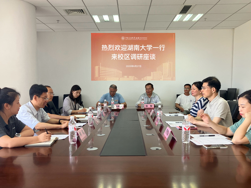 会上,徐小芳代表校区对李勇军一行的到访致以热烈欢迎,对湖南大学两位银龄教师多年来为校区发展作出的贡献表示衷心感谢。校区组织人事部主任宋强介绍校区基本情况,李勇军详细介绍湖南大学历史沿革、学科特色优势,并向校区赠予湖南大学校旗。双方围绕对口援建机制、银龄讲学计划、办学资源共享、师资队伍建设等议题开展深入交流,期待未来有更多的合作机会。