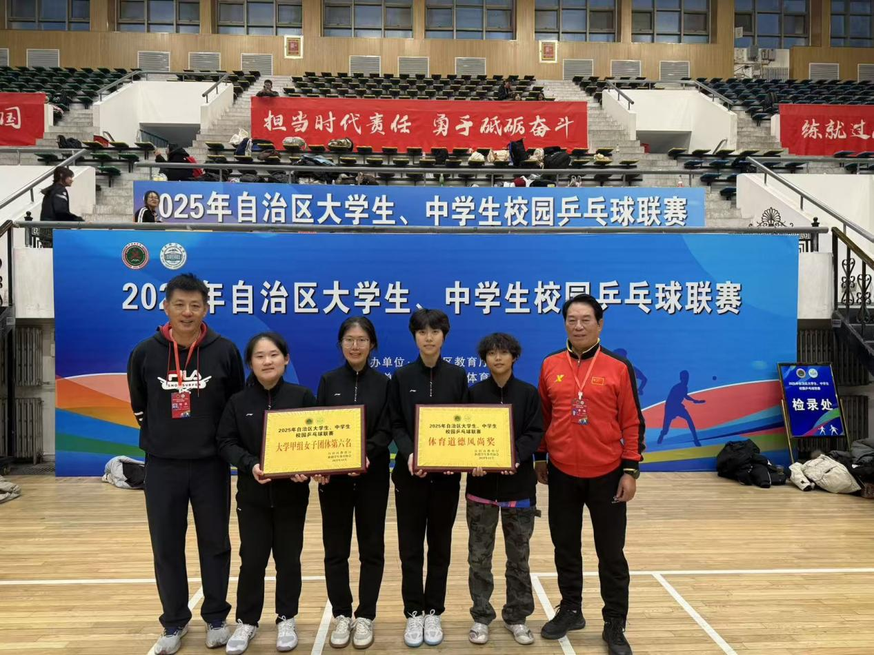 11月6日至11月10日,2025年自治区大学生、中学生校园乒乓球联赛在伊犁师范大学顺利完赛。校区乒乓球队力克省内劲旅,荣获男子团体季军、女子团体第六名;个人及双打赛场捷报频传,王思尧斩获男子单打第三名,邓涵文夺得女子单打第三名,王思尧与李思瑾搭档获男子双打第五名,王路畅跻身男子单打第六名,充分展现了校区师生团结拼搏、昂扬向上的精神风貌。
