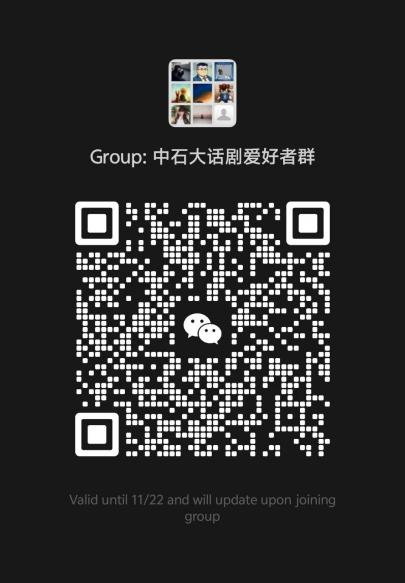 附:话剧爱好者群二维码,欢迎广大话剧爱好者进群,我们将在群中不定时发布演员招募信息,同时,傲卓译剧社长期招新,欢迎广大话剧爱好者进群咨询!