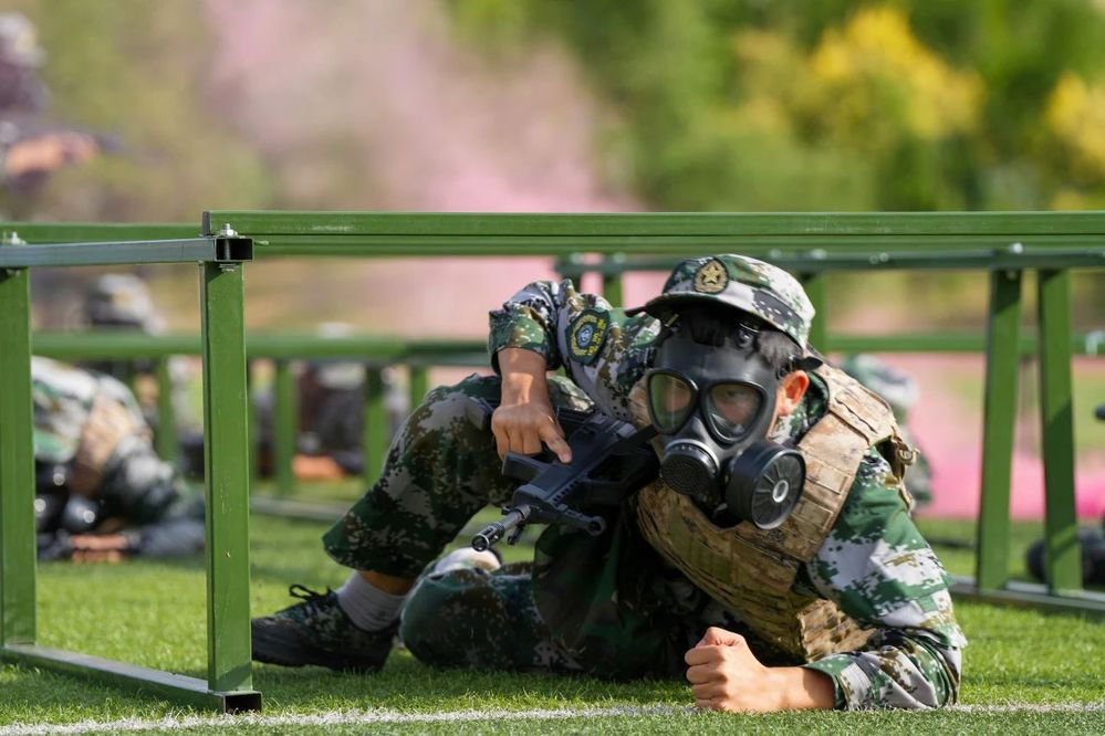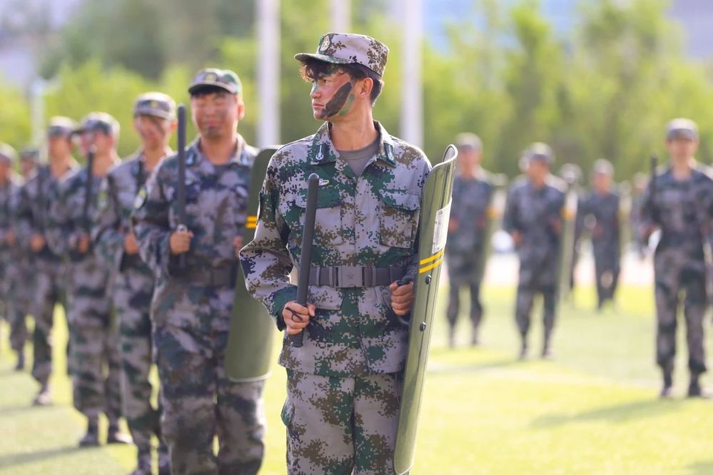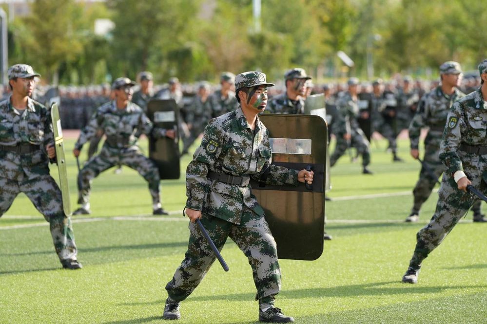随后,2024级新生进行了一场精彩的军训汇报表演。表演中,他们展示了在军训期间学到的各种军事技能和战术动作,包括军体拳、刺杀操、警棍盾牌术、综合战术演练等科目。