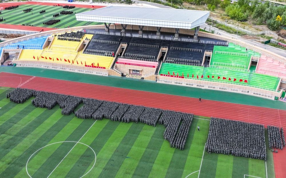 邢晓凯领学习近平总书记给校区首届毕业生的重要回信,红旗操场上空响起阵阵“可堪大用 能担重任”口号声。