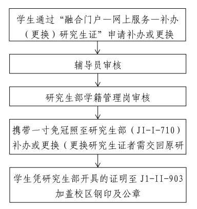 通过“融合门户—网上服务—补办(更换)研究生证”办理。