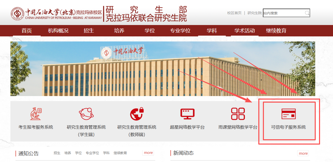 1. 登录研究生部首页https://www.cupk.edu.cn/yjsb/,点击“可信电子服务系统”,使用“统一登录入口”登录。