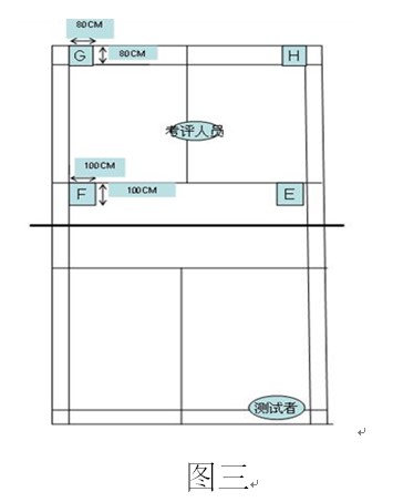 由考评人员发高球,考生站在右场区双打后发球线外进行斜线分别应用高球和吊球技术将球击到指定的区域内(E、F、G、H),并轮转2次。最后两球的落点由考生在E、F中选择一个和G、H中在一个(见图三)。