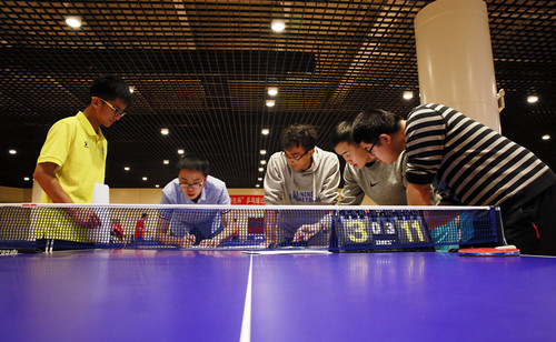 24日进行教职工组的比赛,25日上午进行学生组比赛,下午进行师生对抗。一个个刁钻的角度,一道精美的弧线,一板凶狠的扣杀,无不显示着师生们的实力和智慧。