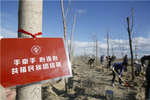 在植树现场,各位教职工与结对亲戚冒着风沙干劲十足,不怕脏,不怕累,默契配合。大家有的挖坑,有的扶苗,有的夯实土层,有的浇水,现场一派热火朝天。经过2个多小时的努力,种下了一棵棵象征着民族团结的“亲情树”。