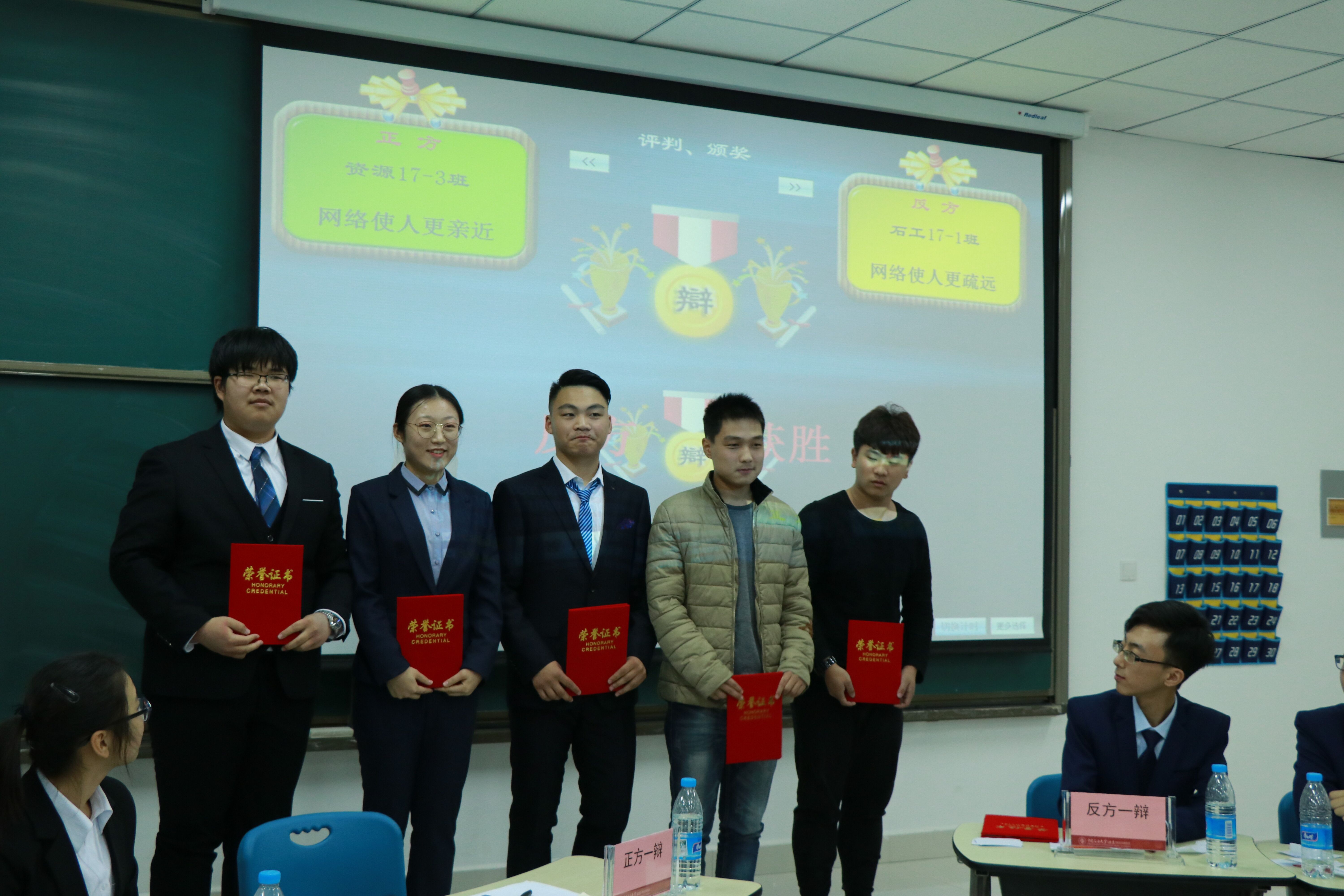 决赛辩题为“网络使人更亲近还是使人更疏远”。比赛中,正方资源勘查工程17-3班鲜明地阐述网络能够消除空间隔阂、打破社会阶层限制,为人类的沟通架起桥梁;而反方石油工程17-1班则以青少年沉迷网络和网络诈骗为例展开反驳,指出网络世界的虚假情感并不能代替亲朋间的促膝长谈。