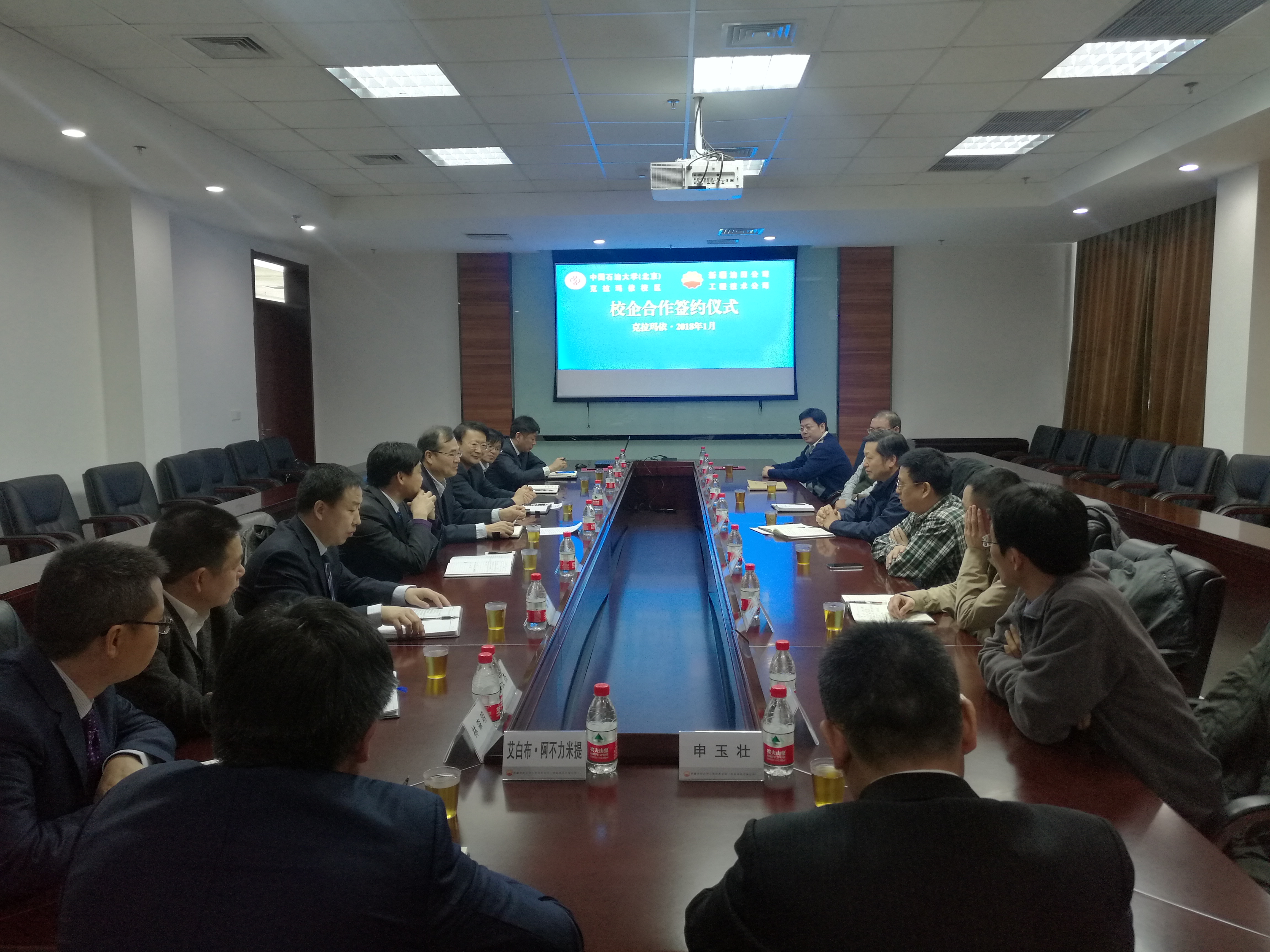 1月10日下午,中国石油大学(北京)克拉玛依校区与新疆油田公司工程技术公司校企合作协议签约仪式在工程技术公司举行。工程技术公司经理庞德新,党委书记张辉,党委副书记、工会副主席向新胜等企业领导,副校长、校区党工委书记、管委会主任张士诚,管委会副主任肖磊及相关职能部门负责人和学院有关教授参加了签约仪式。向新胜与肖磊分别代表企校双方在协议上签字。