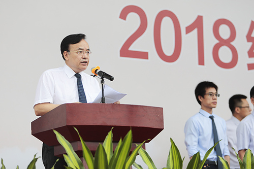 伴随着庄严的国歌声与冉冉升起的五星红旗,开学典礼正式开始。校长张来斌发表讲话,对石大新同学寄语殷殷希望。他代表学校欢迎石大基因的新传承人、代表新希望与新活力的石大新主人——2018级新同学如约而至,与石大一起共迎风雨,同赏晴空,希望他们接受石大精神的洗礼和文化的熏陶,在石大校园度过一段无悔的青春时光。