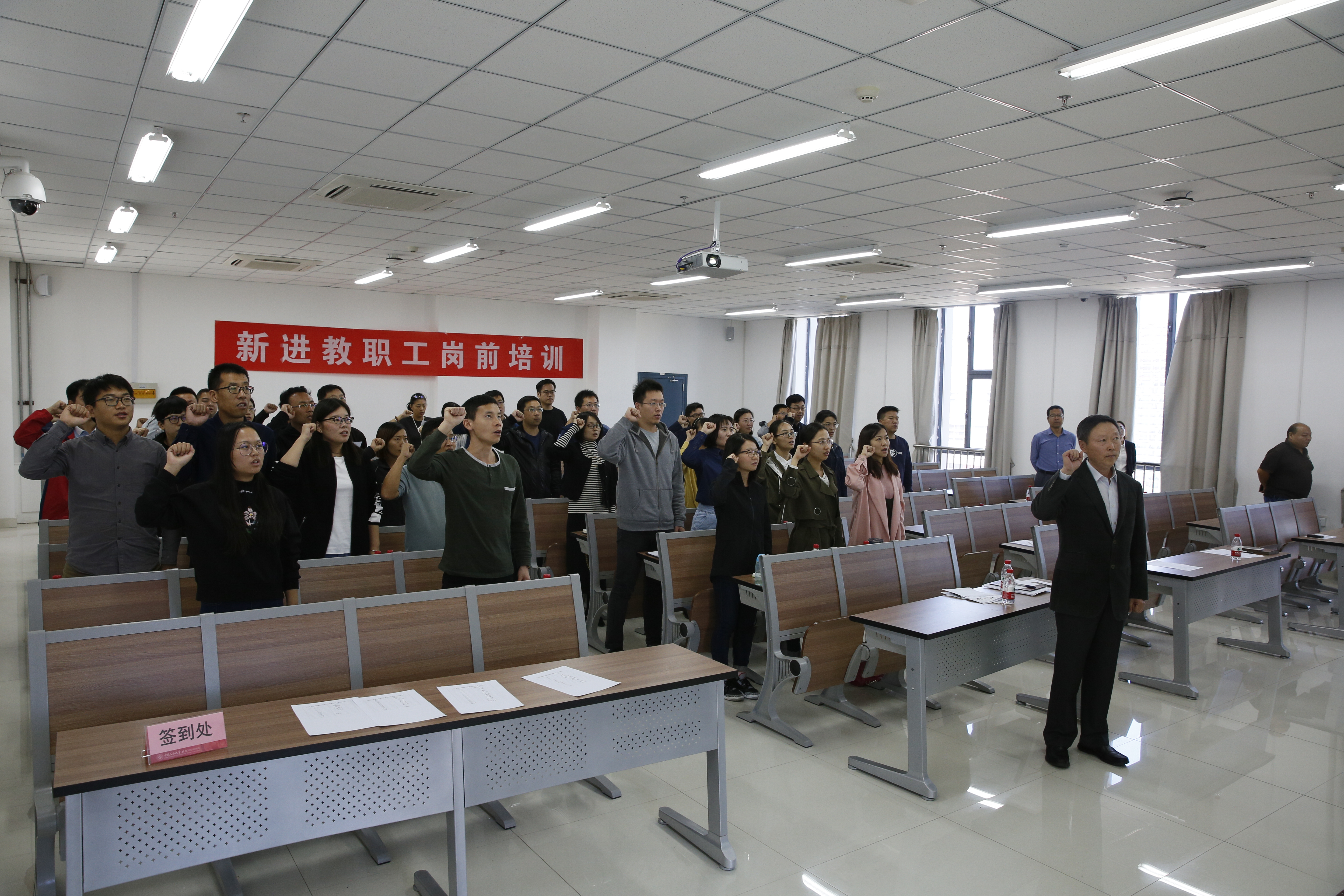 为强化新进教师忠诚党的教育事业,努力当好人民教师的使命感和责任感,在今年岗前培训中新增了入职宣誓环节。校区管委会常务副主任孙旭东领誓,全体新进教师面向国旗,用铮铮誓词表达了努力成为一名合格教师的坚定决心。
