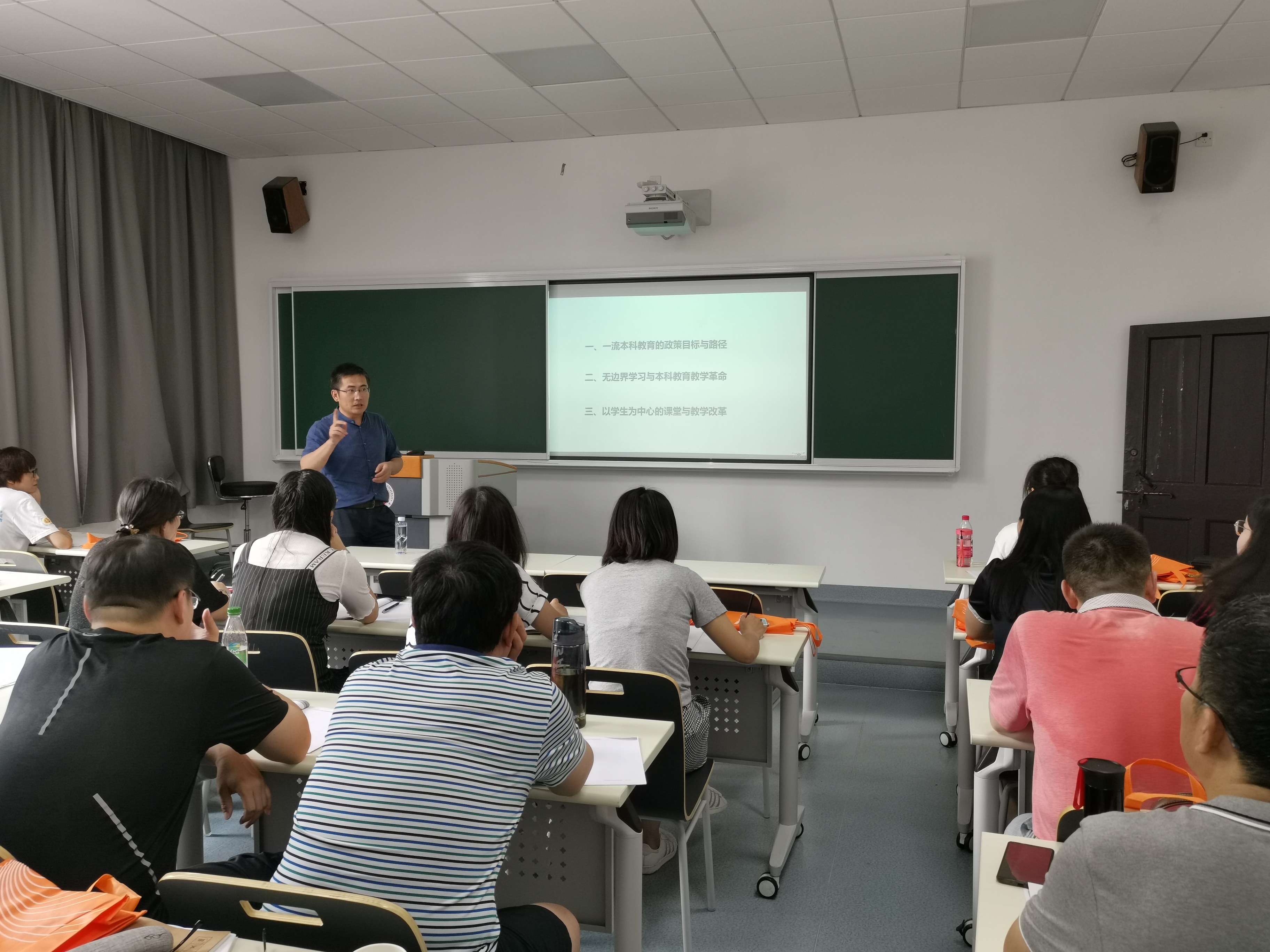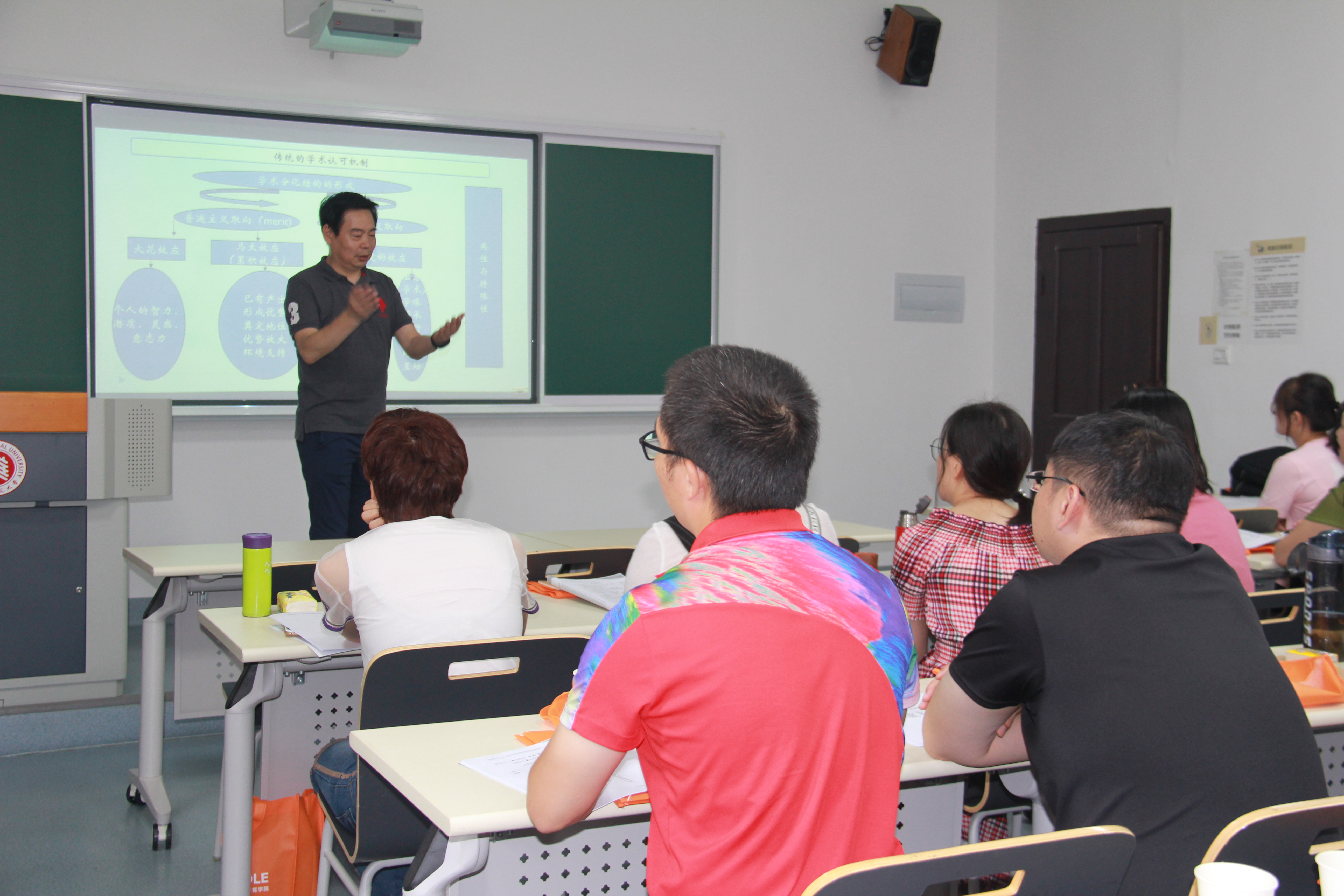 为期三天的集中培训,内容丰富、形式多样。华东师范大学教育学部教授阎光才在第一堂课上做了以“高校教师职业生涯发展”为主题的报告,介绍了高校教师聘任制改革的趋势、各种类型聘任方式的特点,从不同层面阐释了教师专业化发展过程中所面临的种种问题与应对思路,并提出建议;开放教育学院院长闫寒冰以“参与式教学设计”为主题,通过小组讨论、集中点评的方式,讲解了不同理论指导下的教学设计原则以及参与式教学的实施途径;高等教育研究所荀渊教授以“大学教学的组织与管理”为题,介绍了新时代全国高等学校本科教育工作会议确定的本科教育改革目标及我国高等教育现代化的发展目标;考试与评价研究院副院长韩映雄以“如何促进大学生有效学习”为题,阐述了有效教学的基本特征、教学目标及教学组织文件撰写技巧等内容;开放教育学院社会培训部副主任吴昭做了“PPT 艺术设计”为主题的教学,就PPT制作的结构安排、排版技巧、色彩搭配等多方面进行了讲解和演示;庞维国教授以“基于大学生学习需求的教学策略”为主题,从教育心理学的角度,通过生动的案例讲解分析了学生在大学阶段的心路历程,强调学生的发展水平、发展需求与课堂的社会、情感、智力气氛相互作用并共同影响学习效果。