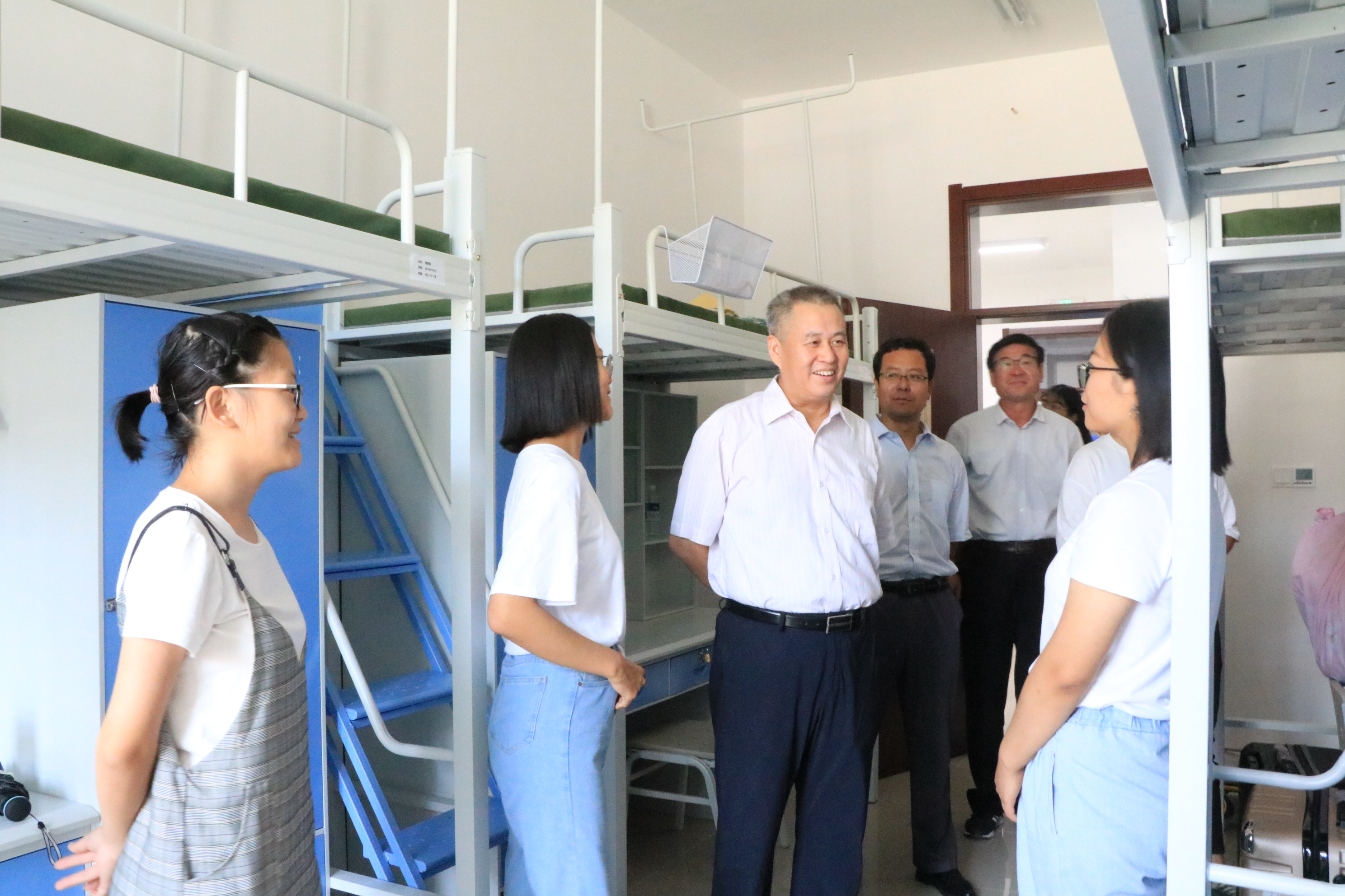 迎新期间,副校长、校区党工委书记、管委会主任陈大恩,校区党工委常务副书记陈桂刚,管委会常务副主任孙旭东和相关部门负责人分别来到现场,欢迎入校的新同学,同时慰问迎新工作人员和志愿者。陈大恩一行走访了各学院迎新点和新生宿舍,了解新生录取及注册情况,新生们倍感温暖、深受鼓舞。 “你从哪里来?”“报到手续办得如何?”“还需要哪些帮助?” 在D10学生公寓,陈大恩与来自吉林长春的新生魏莱亲切交谈,鼓励她尽快适应校园生活,好好学习、健康成长。孙旭东带领校区工会工作人员为奋战在一线的工作人员送上了新鲜瓜果,在送去解暑清凉和关心的同时,也为迎新工作增添一份力量。