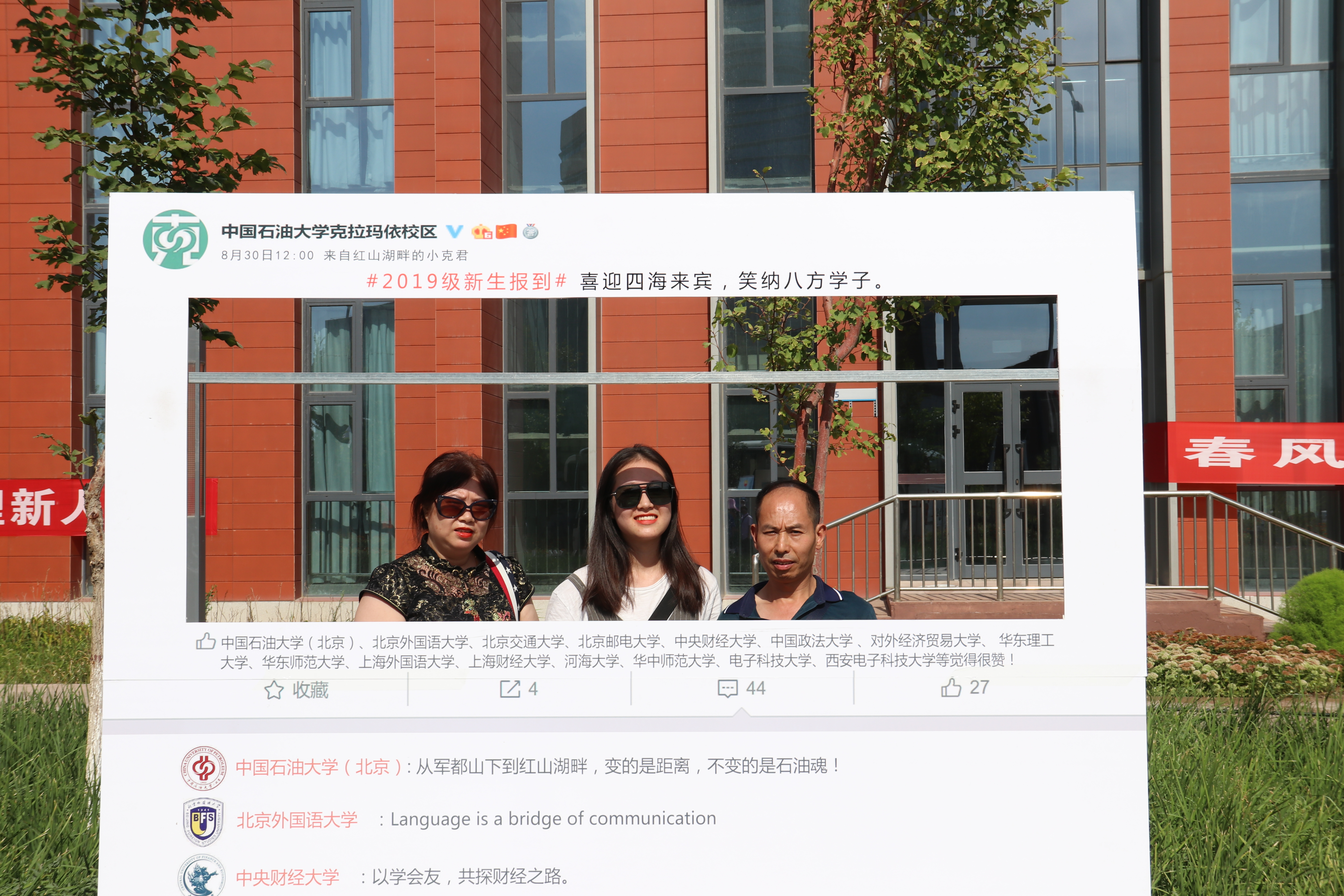 今年正逢新中国成立70周年,迎新活动中自然也不乏相关元素。庆祝中华人民共和国成立70周年的彩旗在校区各主干道路迎风飘扬;文理学院的新生们手持“我为祖国庆生”的标语板一起合影;校区组织新生家长参观克拉玛依一号井文化广场和九龙潭,感受伴随着新中国石油工业发展的克拉玛依在新时代奏响赞歌。