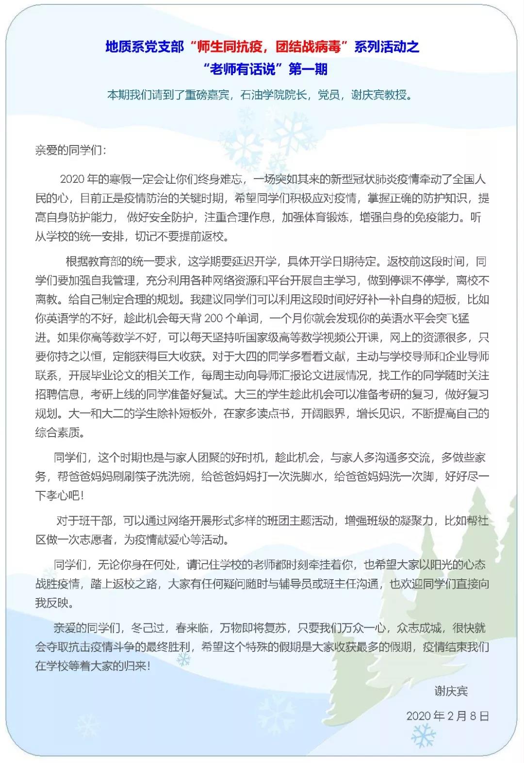 2月8日,石油学院院长谢庆宾教授发表了《致全体学生的一封信》。在信中鼓励同学们坚定信心,做好防护,在家自主学习,保持身心健康,积极参加网络志愿活动。随后,地质系系主任、党支部书记和支部党员也纷纷响应,通过书信的形式向同学们分享了疫情期间的个人感想和学习建议。