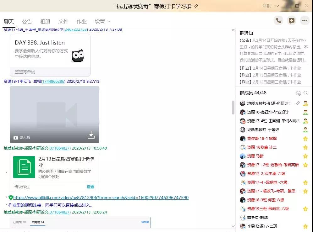 为更好指导学生度过这个“特殊”的假期,地质系教师党员在网上建立了多个学习群,包括“抗击病毒寒假打卡学习群”、“地学考研群”、“构造教研室假期文献阅读群”、“地震勘探原理春季教学群”等。老师们每天在群里为同学们布置作业,推荐网络在线学习资源,分享学习方法,指导学生在家自学。据不完全统计,地质系的老师们每天在线辅导学生近200人次,批改作业百余份。这些举措帮助学生们逐渐进入到学习状态,安心在家准备新学期的课程。加入学习群的同学们都表示要在老师们的监督下,克服各种不利的因素,通过安心在家学习为全国阻击疫情贡献力量。