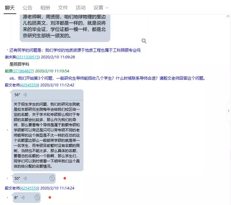 针对同学们在寒假期间关注的各类问题,地质系党支部发起在线答疑活动。第一期考研在线答疑活动由石油学院院长谢庆宾教授牵头,地质系硕士生导师们在150分钟的时间里在线回答了相关提问近30项,内容包括关于考研政策、考研流程、考研专业和导师的选择及各科复习方法等。在线答疑后,有80人加入了“地学考研”群,共同备考2021年研究生入学考试。参加在线答疑的同学们纷纷表示,这场答疑使大家更清楚地认识到考研的重要性,同时也明确了自己的复习方向。除了集中答疑外,地质系的老师们还在各自辅导的班级群内开展了各类形式多样的答疑活动,有些老师还当起了“主播”,为同学们在线直播解决各类问题。这些丰富多彩的活动拉进了师生的距离,让每天的陪伴为同学们树立了战胜病毒的勇气。