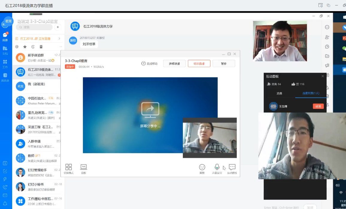 为确保教学工作顺利开展,石油学院领导班子、系主任全面参与到每门课的课程群中,对教学质量、课程进度以及学生反馈等进行全面审查,并通过不定期随机抽查,全方位确保线上教学质量。老师们积极参加线上教学平台培训,建设并完善个人线上课程资源;通过雨课堂、钉钉、中国大学MOOC等平台,完成了44门课程的录制、上课互动、辅导答疑等工作,确保线上教学各环节不打折。各系及时组织老师们线上交流,一起来听听老师们的经验分享吧。