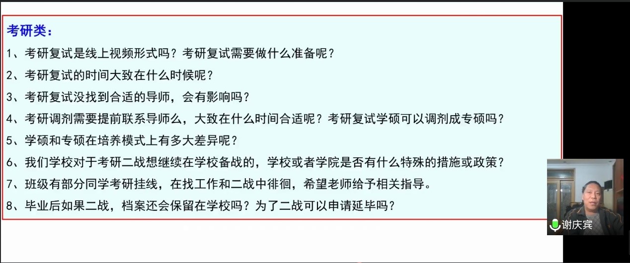 3月9日至10日,学院各系分别召开了各级学生线上座谈会。在2016级召开的视频专题座谈会上,各系主任分别总结了目前各专业考研、签约的情况,对毕业设计的各项内容进行安排,强调了开题报告的要求。石油学院院长谢庆宾在总结讲话中分析了当前疫情防控和国际油价对大学生考研和就业的影响,鼓励毕业生坚定信心,充分准备,合理确定求职目标,在积极的求职的同时认真准备毕业设计。最后,参加会议的老师回答了毕业生提出的各类问题,为毕业生考研复试、求职出谋划策。