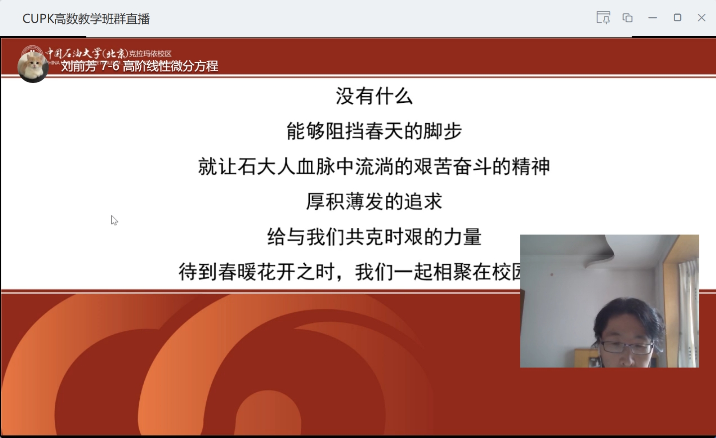 师生齐心,防疫学习两不误 。2月24日上午,新学期第一堂线上高数课正式开讲。课前,数学系主任杨立敏老师给大家上了一堂特殊的“第一课”,在“润物细无声”中深化课程思政建设,落实立德树人根本任务。她把疫情当作教材融入专业课教学之中,围绕科学抗“疫”、爱国主义教育、理想信念教育、心理调适、当代大学生的责任与使命等内容,积极引导学生坚定战“疫”信心、厚植爱国情怀、践行责任担当,努力成长为德智体美劳全面发展的社会主义事业合格建设者与接班人。