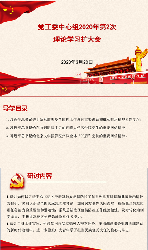 在本次习近平总书记关于新冠肺炎疫情防控工作系列重要讲话和批示指示精神专题学习会上,与会人员集体学习了2月23日以来习近平总书记关于新冠肺炎疫情防控工作系列重要讲话和批示指示;结合习近平总书记给在首钢医院实习的西藏大学医学院学生和给北京大学援鄂医疗队全体“90后”党员的两封重要回信精神学习交流。与会人员表示要切实把思想和行动统一到习近平总书记重要讲话精神和党中央关于统筹当前疫情防控和经济社会发展决策部署上来,进一步讨论完善开学工作预案,确保师生返校平稳有序、安全高效,坚决打赢高校疫情防控阻击战。