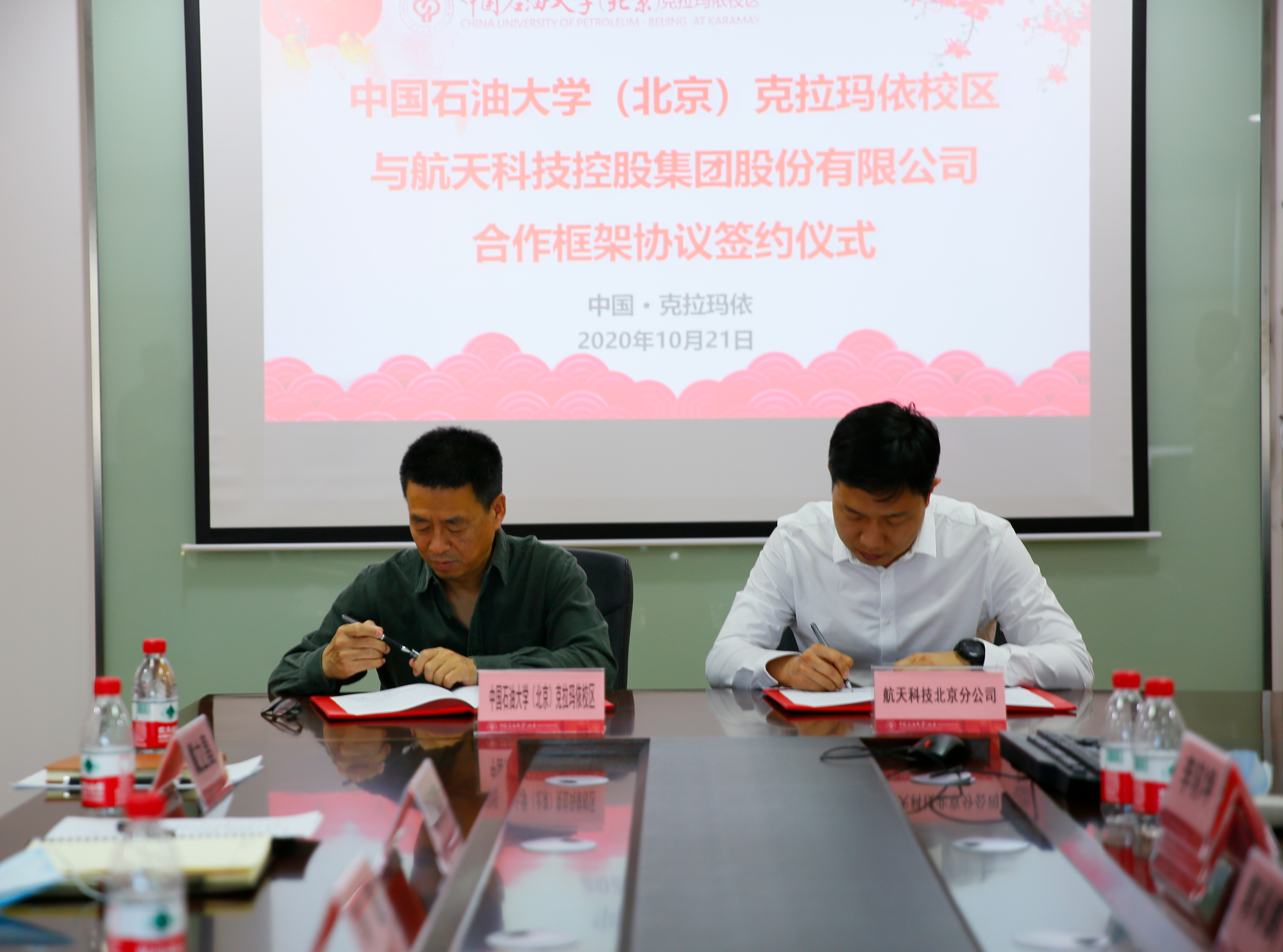 10月21日下午,校区与航天科技控股集团股份有限公司油气物联网技术创新与应用中心合作框架协议签约仪式在校区J1行政楼Ⅱ901会议室举行。航天科技北京分公司总经理郭禄鹏一行7人,校区管委会副主任肖磊,石油学院院长谢庆宾、工学院院长郭绪强及相关职能部门负责人出席签约仪式。肖磊和郭禄鹏代表校企双方签署协议。