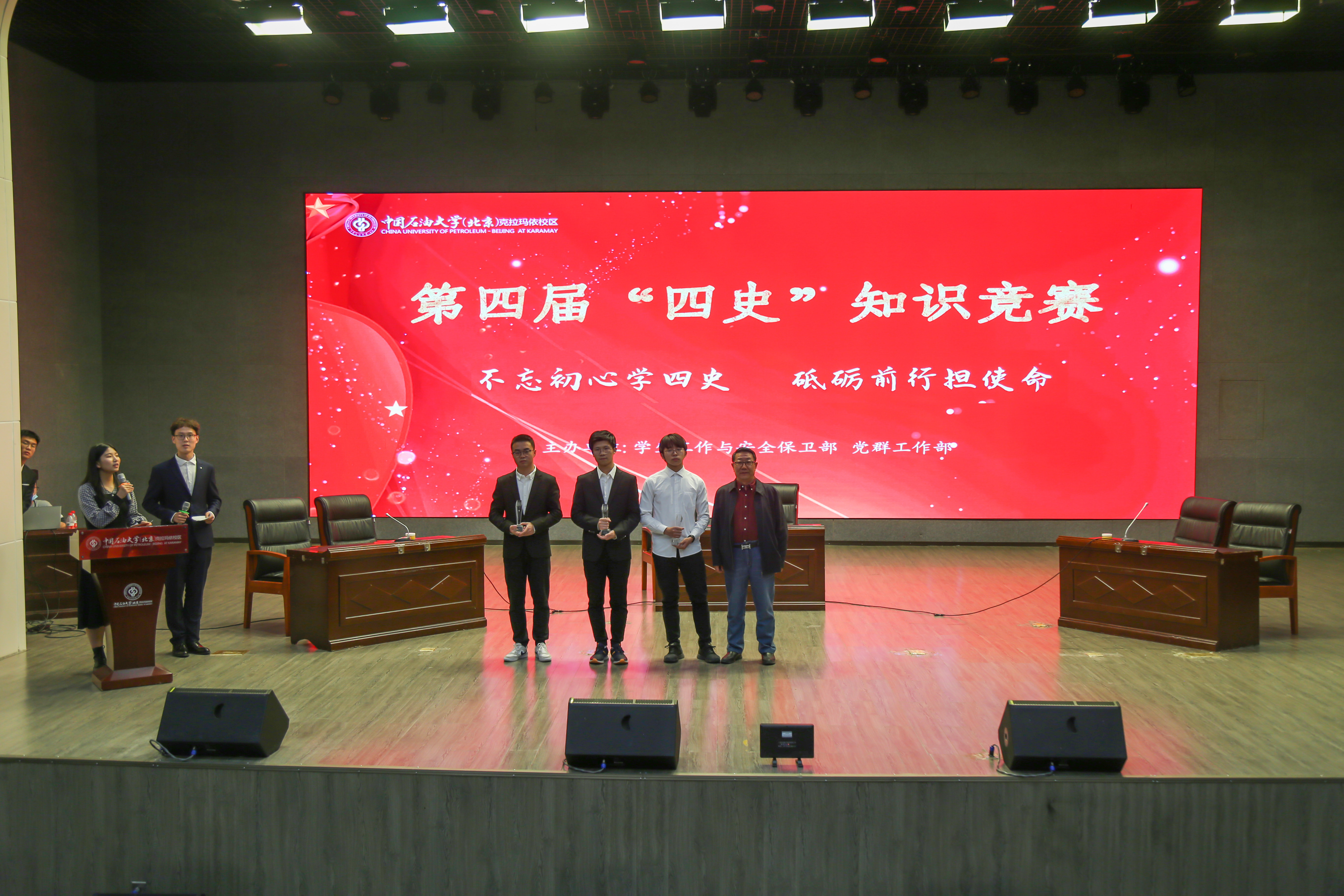 为深入学习贯彻落实习近平总书记重要回信精神,引导校区师生全面了解党史、新中国史、改革开放史和社会主义发展史,传承红色基因与石油精神,日前,校区成功举办第四届“不忘初心学四史 砥砺前行担使命”知识竞赛决赛。本次比赛吸引了来自各学院的150余名学生报名参赛。经过初赛的选拔,最终共有24名学生组成12支代表队晋级决赛。校区文理学院思政系许尔才教授、石油学院辅导员刘易非、工学院辅导员黄雪姣以及文理学院辅导员张铭书受邀担任决赛的嘉宾。