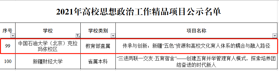 日前,教育部思想政治工作司公布了2021年高校思想政治工作有关培育建设项目入选名单,经组织推荐、专家遴选、结果公示等程序,由中国石油大学(北京)副校长、克拉玛依校区党工委书记、管委会主任陈大恩教授主持的“传承与创新:新疆“五色”资源和高校文化育人体系的耦合与融入路径”入选高校思想政治工作精品项目。这是校区第1次入选该项目,也是学校继“‘一线、两支撑、四平台’创新创业实践育人体系的构建与实施”项目之后,第2次获批教育部高校思政工作精品项目。