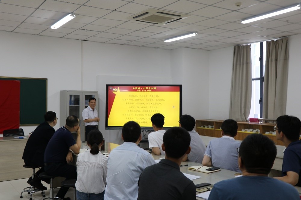 本次活动分为三个环节。在“红色诗歌诵读”环节中,每位党员分别选取一首红色经典诗歌进行诵读并为大家讲述诗歌创作背后的故事。朗诵篇目既有抗战时期创作的《忆秦娥•娄山关》《七律•长征》,国共战争时期的《七律•人民解放军占领南京》,也有全面建设社会主义时期的《七律•有所思》《念奴娇•井冈山》,更有新世纪的《旗帜更鲜艳》《可爱的中国》等。在朗读者们的深情讲述中,党员们仿佛又回到了诗歌创作的年代,感受伟大的时代精神,共同传承红色基因。