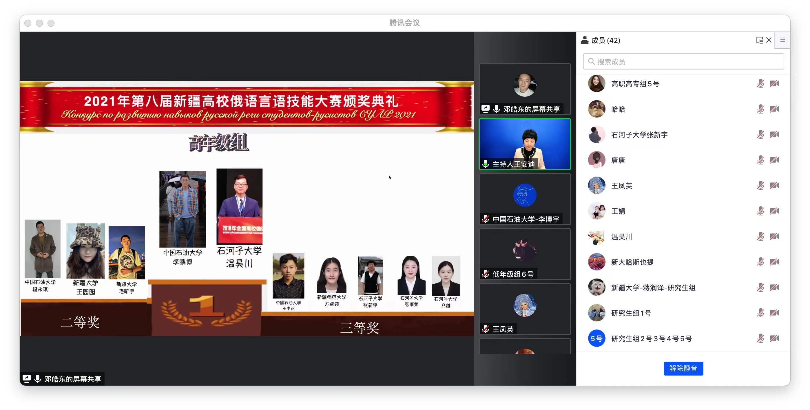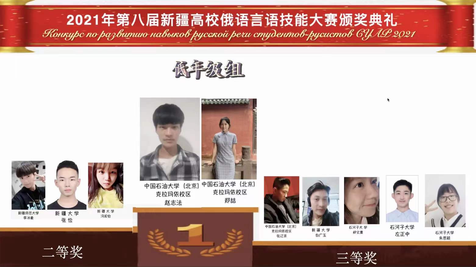 本次大赛共设俄语专业研究生组、俄语专业高年级组(本科3-4年级)、俄语专业低年级(本科1-2年级)、本科非俄语专业组和高职高专组等5个组别。本科低年级组和高年级组共有来自新疆大学、新疆师范大学、石河子大学、喀什大学等7所参赛学校的54名选手进入复赛。最终,校区俄语专业2020级学生赵志法和郑喆两位同学荣获低年级组一等奖,张辽源荣获低年级组三等奖;俄语专业2018级学生李鹏博荣获高年级组一等奖,段永琪、王中正分别荣获高年级组二等奖和三等奖。