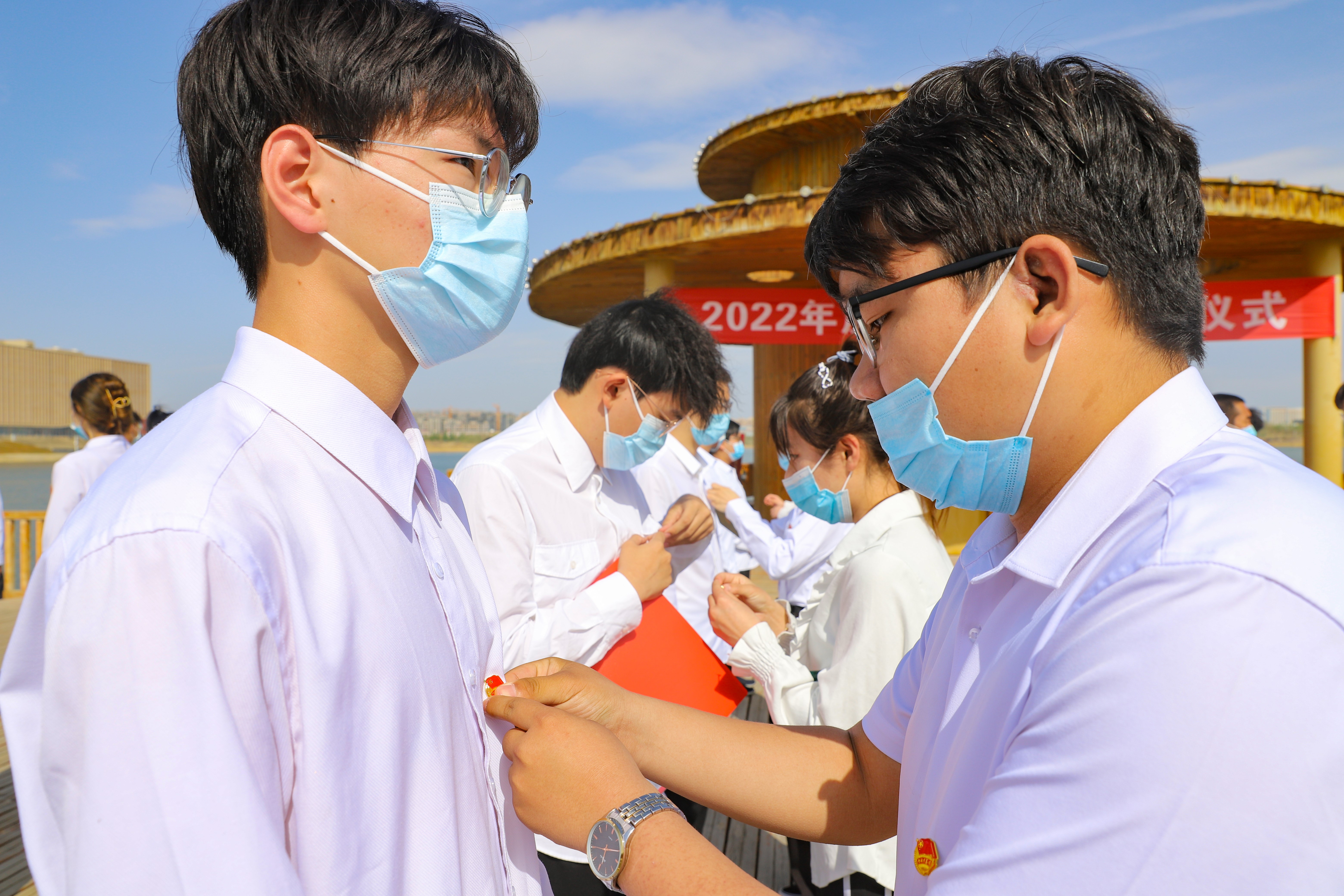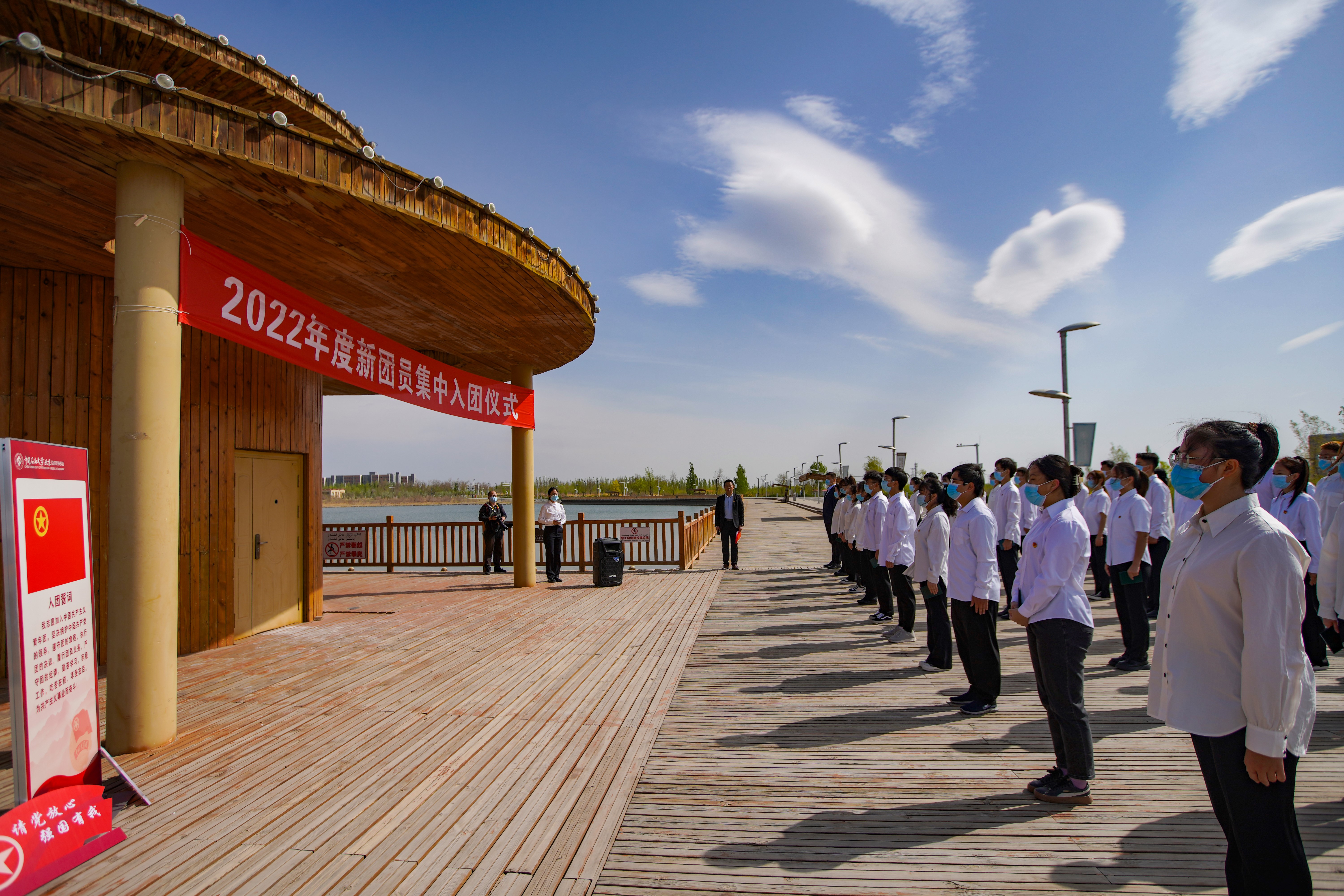 为迎接党的二十大胜利召开,进一步增强青年大学生团员荣誉感,强化仪式教育,厚植爱党、爱国情怀,4月22日上午,校区联合新疆第二医学院、克拉玛依职业技术学院在红山湖观景台共同举行2022年新团员集中入团仪式。克拉玛依团市委党组书记、团委书记,市委教育工委副书记叶尔布拉提·热加甫及三校团委教师代表到场参与。仪式由校区学生工作与安全保卫部主任林强主持。