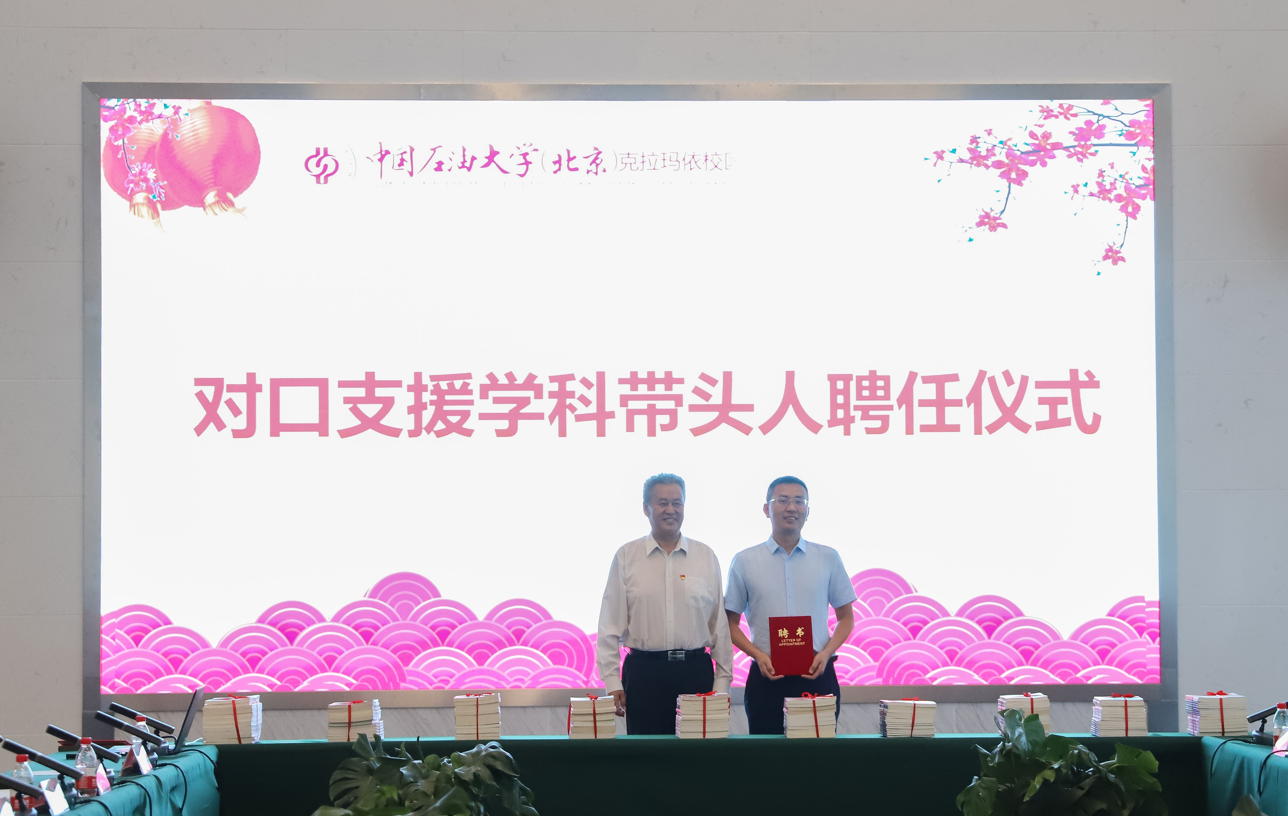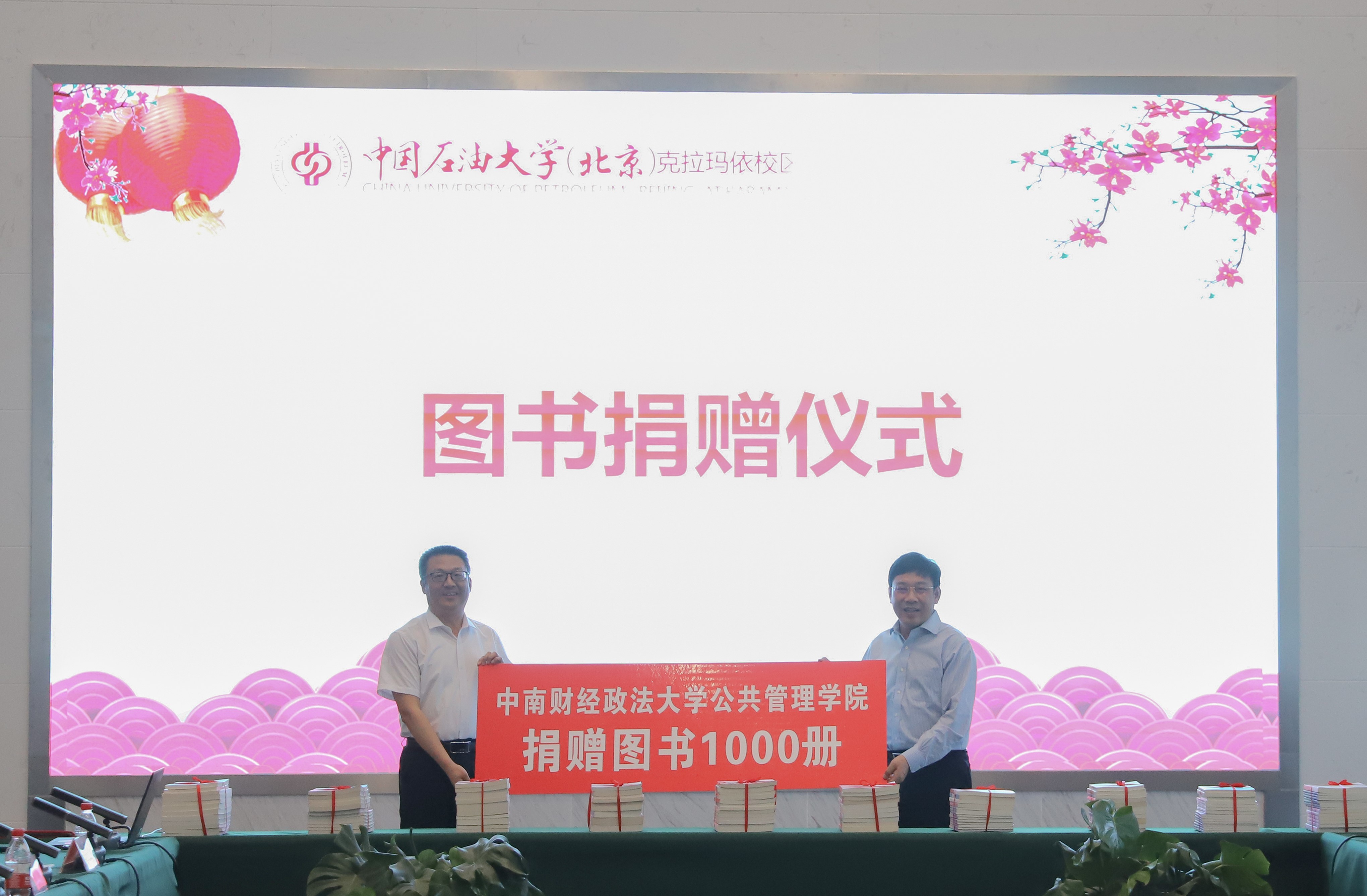 陈大恩为对口支援校区行政管理专业学科带头人庞明礼颁发聘书,副校长李军代表校区接收中南财经政法大学捐赠的1000册图书。