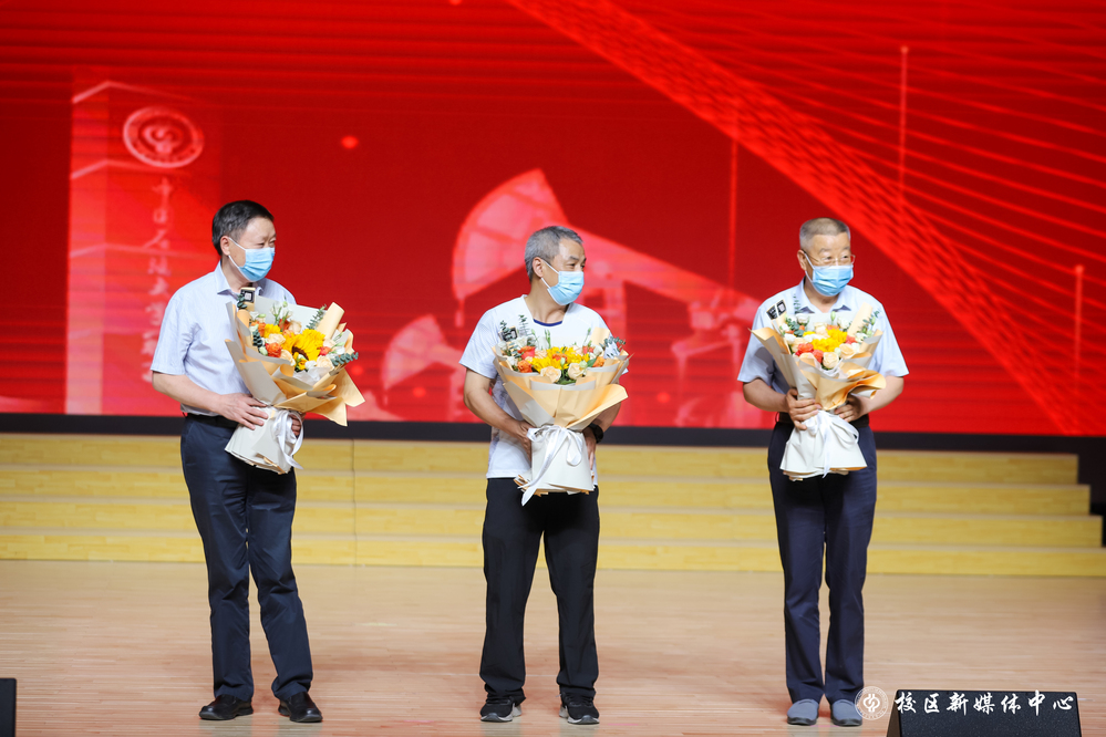 在教师荣休仪式上,校区新进教职工代表为2020年以来在校区光荣退休的3位老教师献花,寓意“新”“老”交替,体现“为学为师、立德立言”之风薪火相传,生生不息。