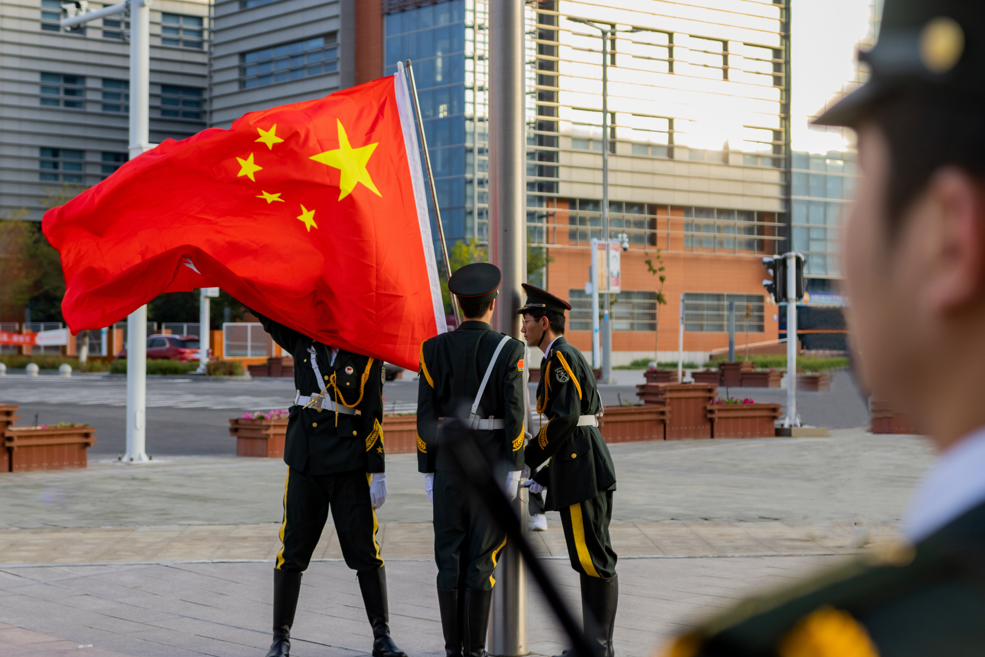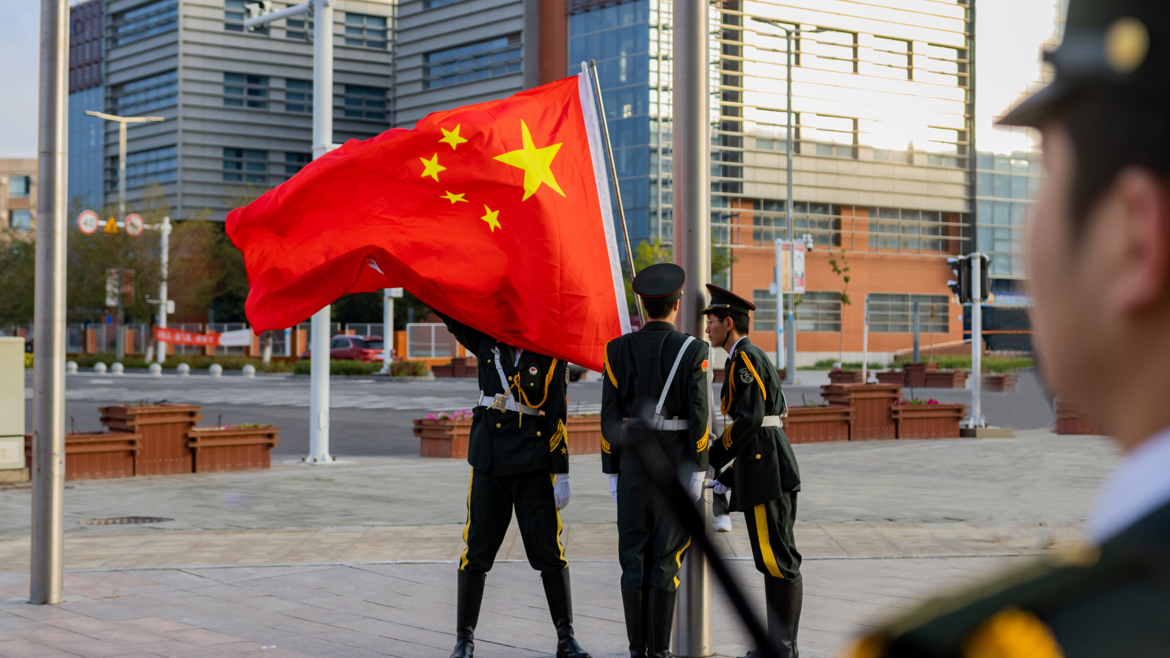 上午九点,在J1楼德政广场,国旗仪仗队迈着铿锵有力的步伐,护送国旗走向升旗台。随着鲜艳的五星红旗冉冉升起,全体师生列队肃立,高唱国歌,为新中国73周年华诞深情礼赞,向为国家奋斗牺牲的人民英雄致以崇高敬意。