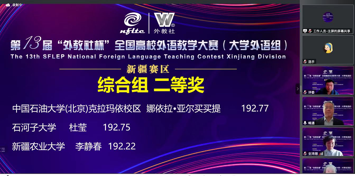 11月20 日,第十三届“外教社杯”全国高校外语教学大赛(大学外语组)新疆赛区决赛在新疆农业大学举行。来自全疆15所本科院校的33名外语教师参加比赛。经过两轮的激烈角逐,校区文理学院外语系教师娜依拉·亚尔买买提荣获新疆赛区决赛二等奖、蔡华荣获复赛三等奖。