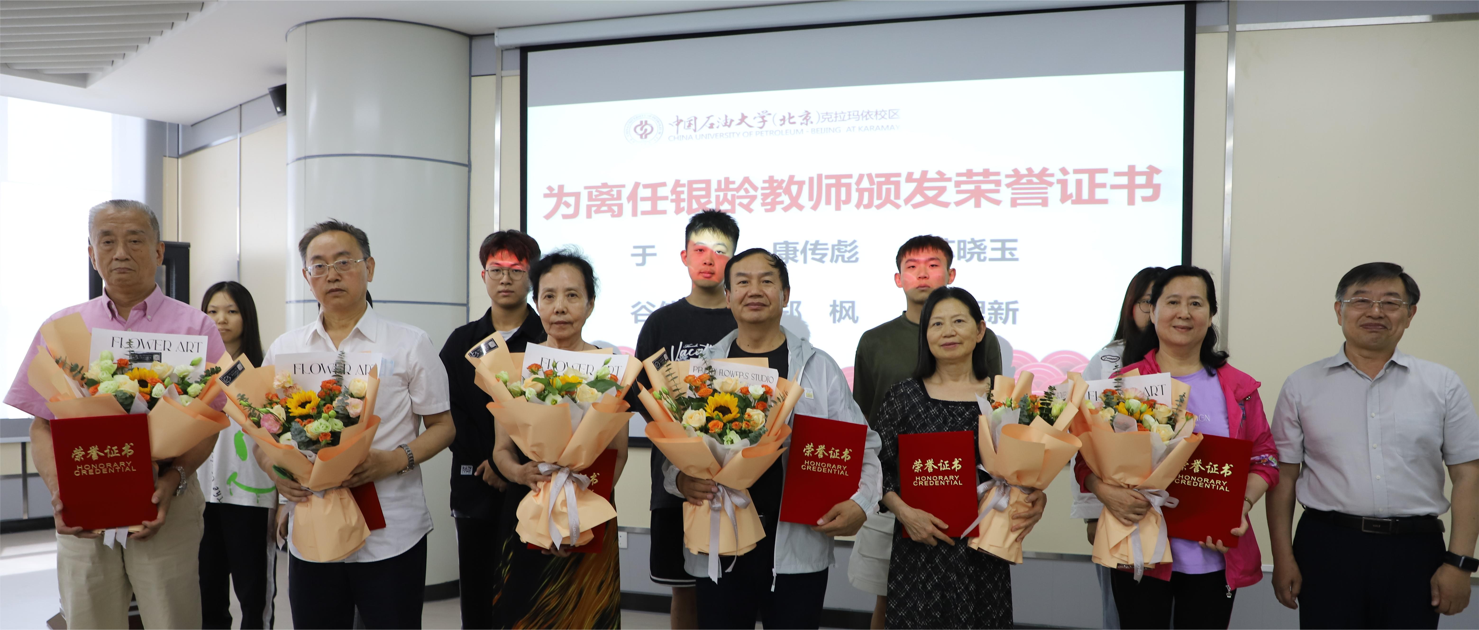 会上,胡庆喜为即将离任的6位银龄教师颁发了荣誉证书,学生代表为老师们献上鲜花,感谢老师们的辛勤付出。