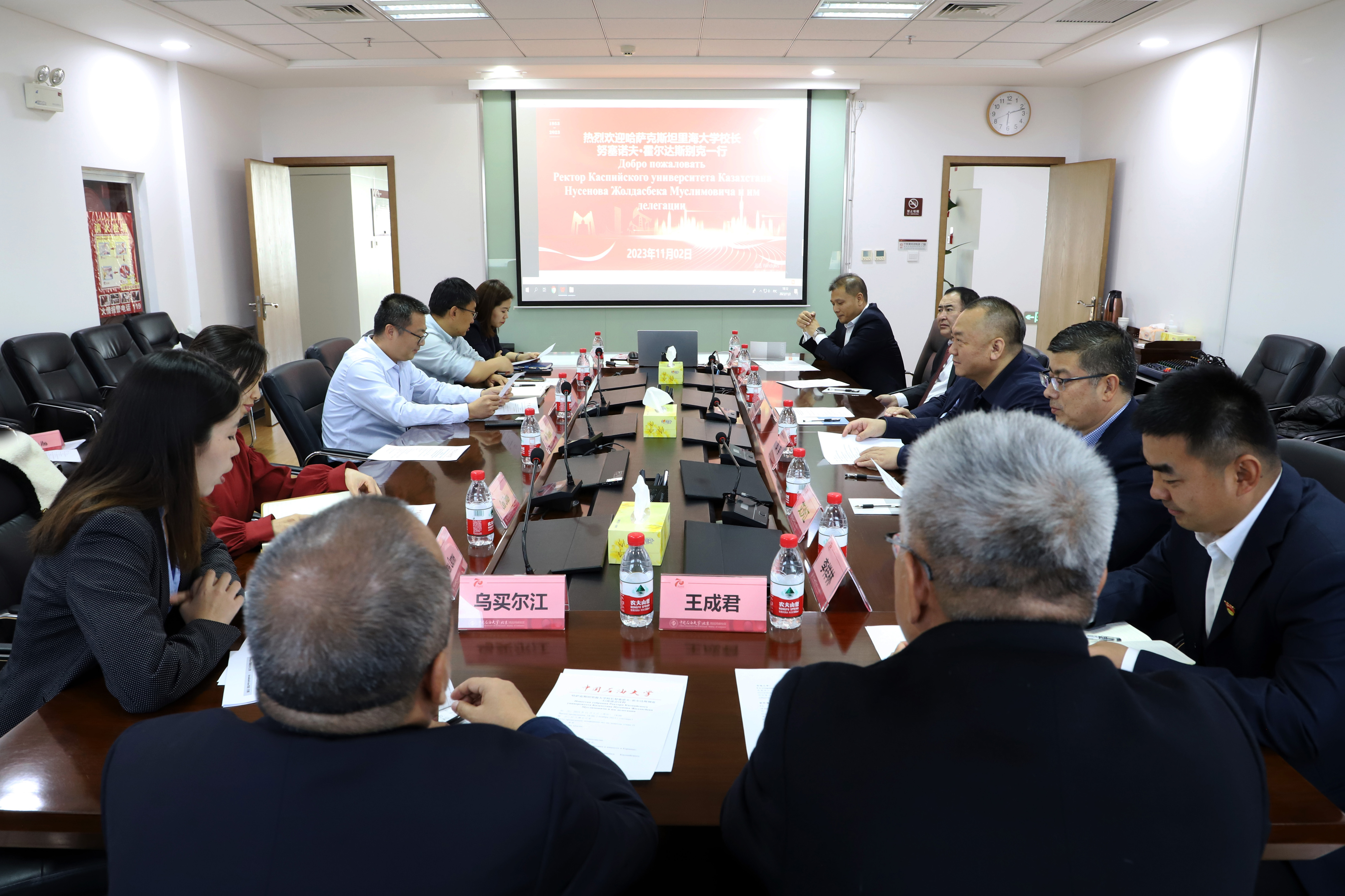 11月2日,哈萨克斯坦里海大学校长努塞诺夫·霍尔达斯别克一行到校区调研交流,克拉玛依新科澳石油天然气技术股份有限公司党委书记、总经理邵宇一行陪同调研。校区校长李军、相关职能部门负责人热情接待了努塞诺夫·霍尔达斯别克及邵宇一行。