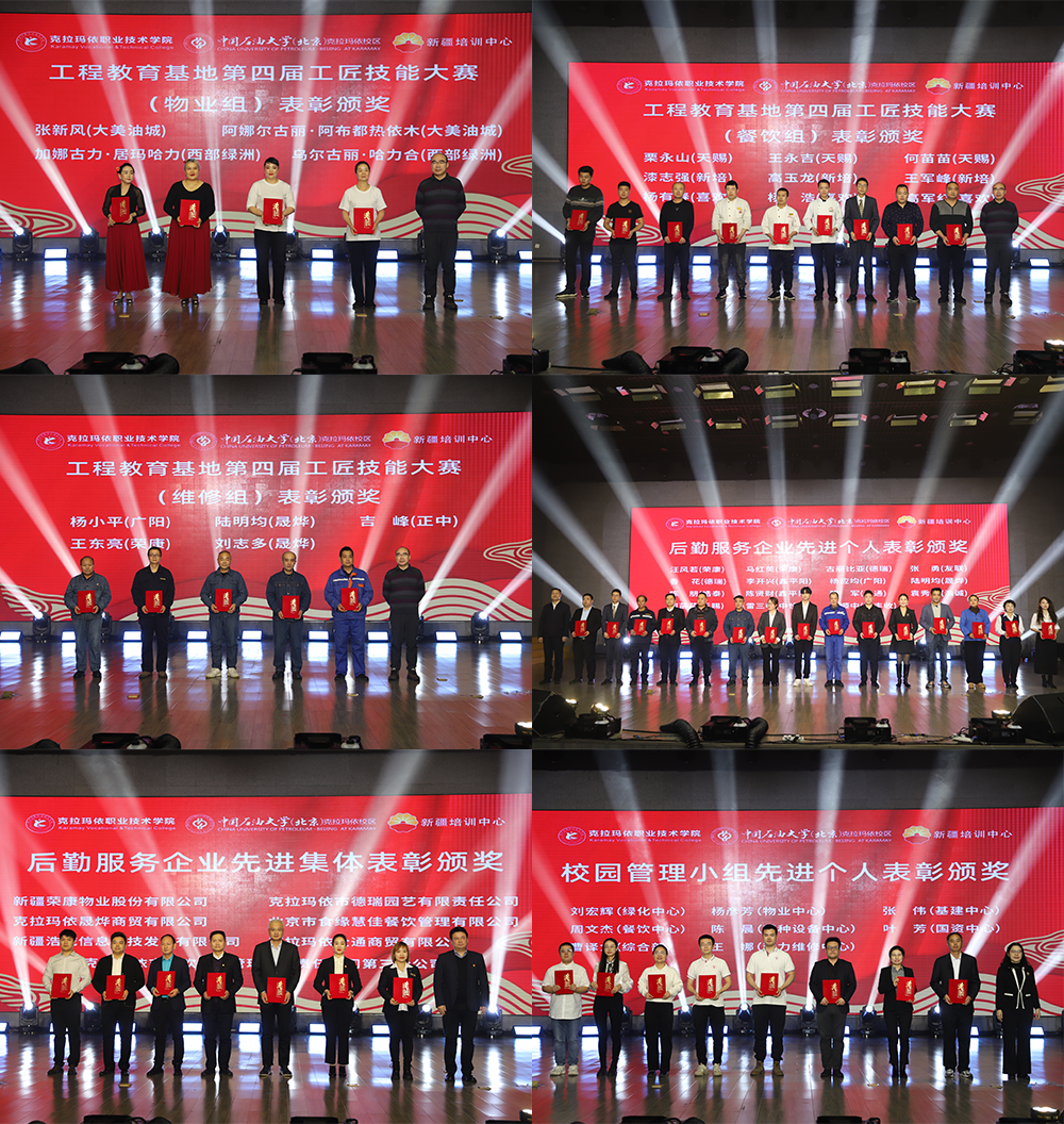 参会领导为荣获大学城第四届工匠技能大赛优胜奖,后勤服务企业先进集体、先进个人,校园管理工作小组先进个人等荣誉的后勤工作人员颁奖。
