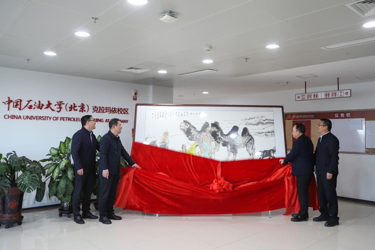 4月19日下午,中国石油大学(北京)克拉玛依校区在J1行政楼举行中国画作品《克拉玛依之歌》揭幕仪式。该作品是学校党委为庆贺克拉玛依校区党员大会所赠。学校党委书记王同奇,党委副书记蒲俊霖,副校长、克拉玛依校区党委书记刘坚,克拉玛依校区校长李军,校区班子成员、学校和校区相关职能部门负责人、教职工代表参加活动。