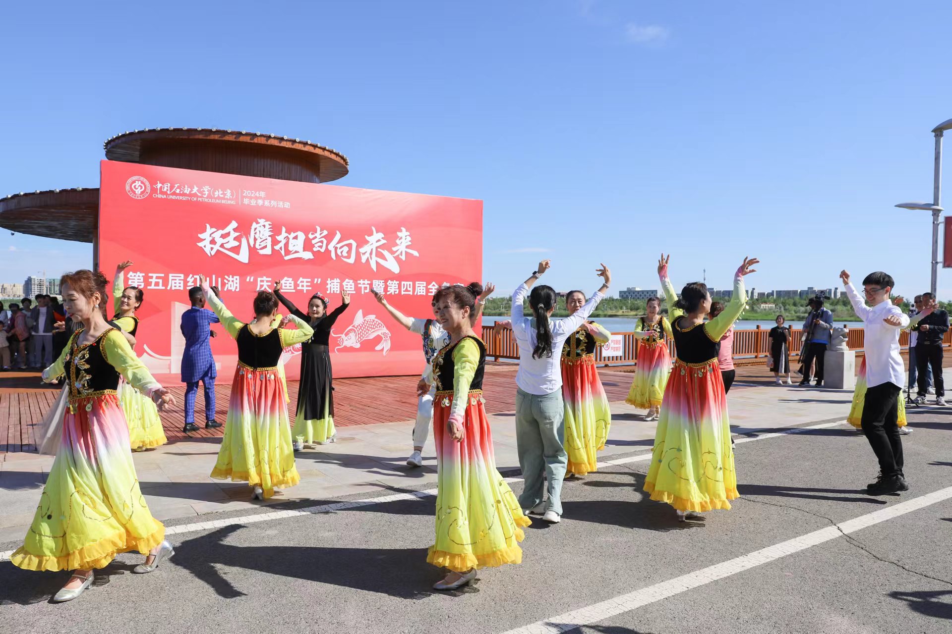 市文化馆演员及在校生为毕业生们送上了《麦西来甫》民族舞表演及《上春山》合唱。拉网捕鱼前,毕业生以学院为单位开展了拔河比赛。红山湖畔,师生们载歌载舞,现场气氛热烈,每一位毕业生脸上都洋溢着对未来的无限憧憬。