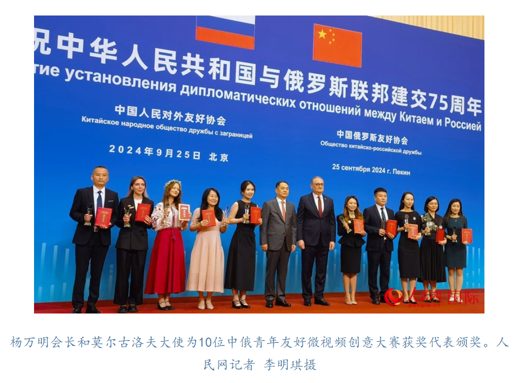 招待会上,杨万明、莫尔古洛夫为10位中俄青年友好(微视频)创意大赛获奖代表颁奖。