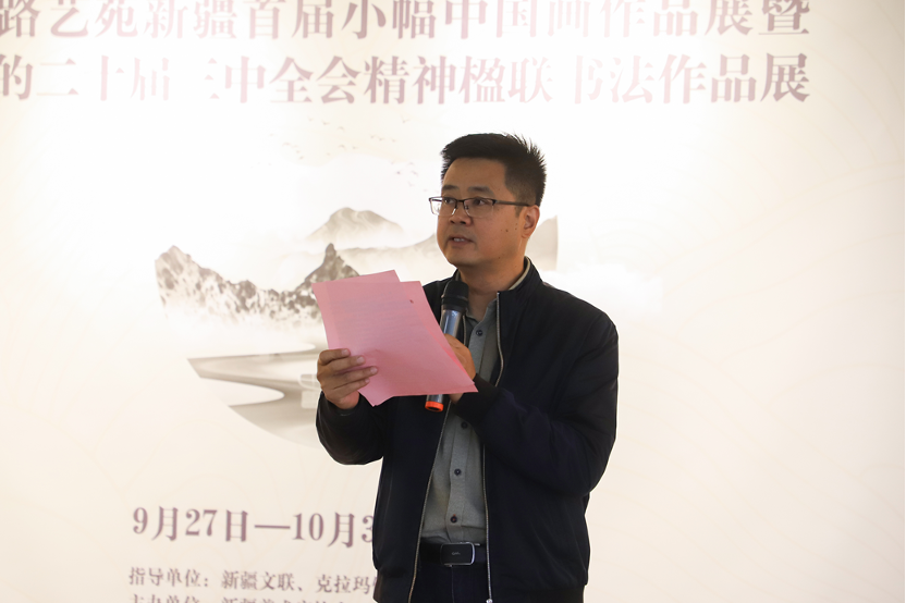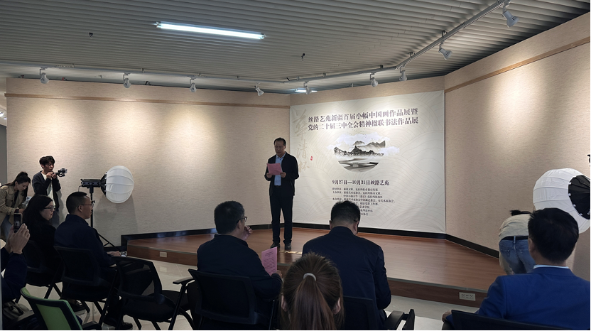9月27日上午,以笔墨丹青为媒,共绘新时代新疆壮丽图景,共书校区新时代美育高质量发展篇章。为庆祝中华人民共和国成立75周年,深入贯彻落实党的二十届三中全会精神, “丝路艺苑”新疆首届小幅中国画作品展暨楹联书法作品展在校区丝路艺苑展厅开幕。市委宣传部副部长、市文联党组书记、主席丁赛,校区校长李军出席开幕式。市文联、市美协、市书协、“文艺两新”及中石大师生代表近50人参加仪式。开幕式由文理学院/文化艺术学院院长殷文主持。