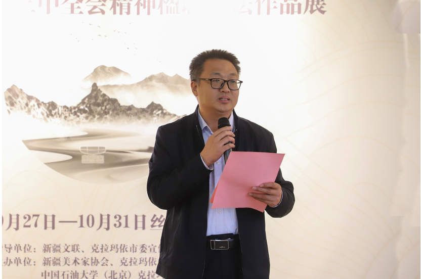 李军在致辞中表表示,古以文载道,今以文聚力。校区作为城市文化主力军、美育主阵地,始终牢记文化使命,勇挑美育大梁,自2015年教育部批准设立以来,在校园文化建设方面以习近平总书记重要回信精神为指引,围绕文化润疆工作,形成了以“到祖国最需要的地方去”为核心的文化价值理念,打造了“五位一体”的五色文化育人体系,营造了以铸牢中华民族共同体意识为内涵的浓厚校园文化氛围。2022年中石大润物生文艺创作基地正式启用是校区全面贯彻党的教育方针,培养时代新人的重要探索,是审美教育、情操教育和心灵教育的重要抓手,对于落实立德树人根本任务具有不可替代的重要作用。希望校区加强与自治区、克拉玛依市相关文艺组织、部门的文化交流合作,联合建立美育教育实践基地,扩大美育教育合作范围,为师生引进更多高质量的美育资源。