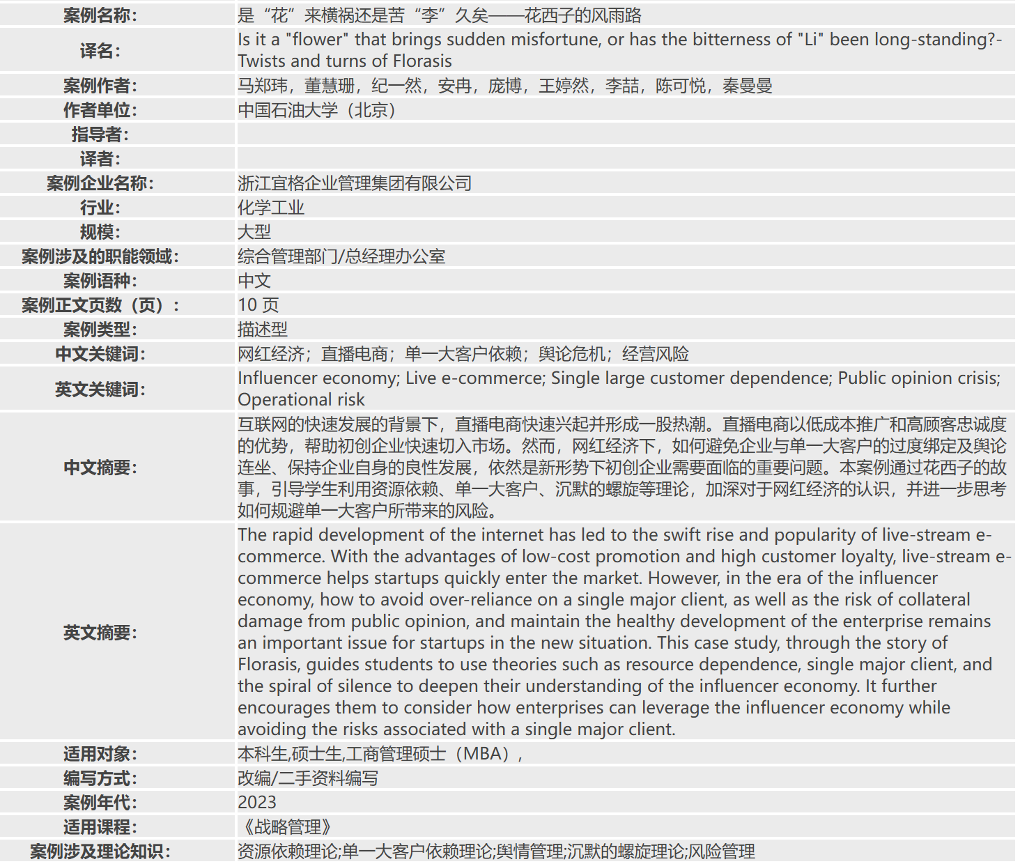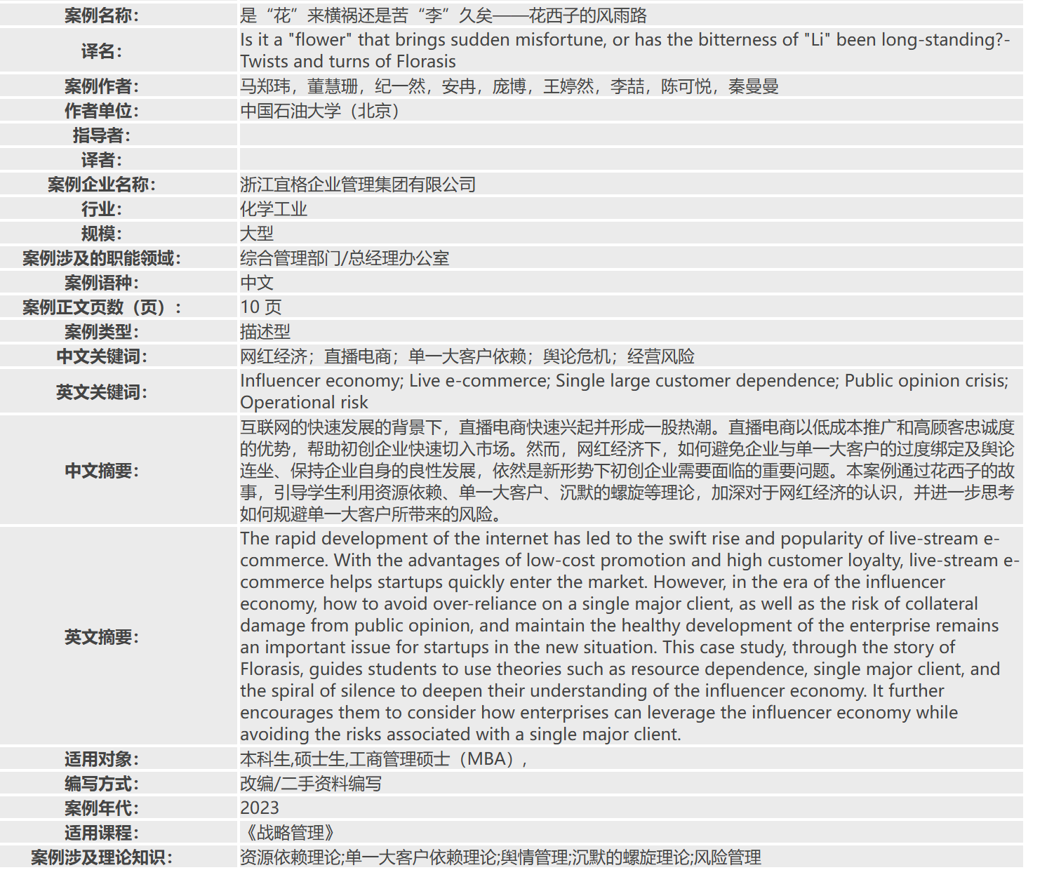 近日,工商管理学院教授马郑玮等四位老师和研究生共同撰写的教学案例《是 “花”来横祸还是苦“李”久矣 —— 花西子事件的思考》(编号:STR-2374)入选中国管理案例共享中心案例库。