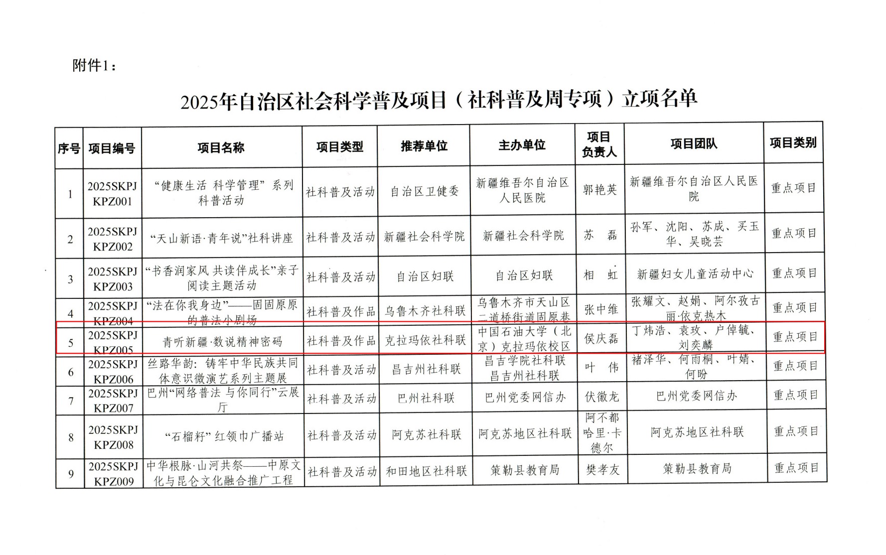近日,2025年自治区社科普及项目(社科普及周专项)立项名单公示,由校区科技与信息部和克拉玛依市社科联推荐,工商管理学院/马克思主义学院党委副书记侯庆磊牵头、校区党群工作部联合申报的“青听新疆·数说精神密码”社科普及项目获得重点项目立项(自治区重点项目共15项)。