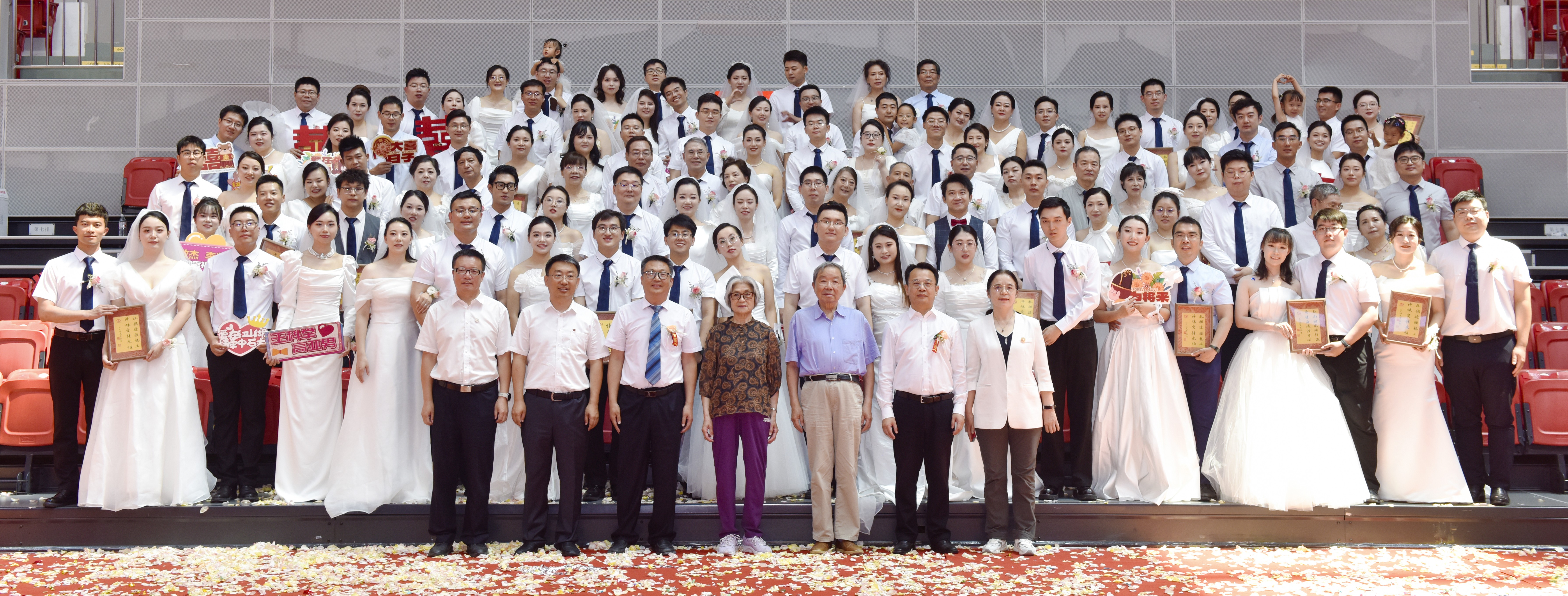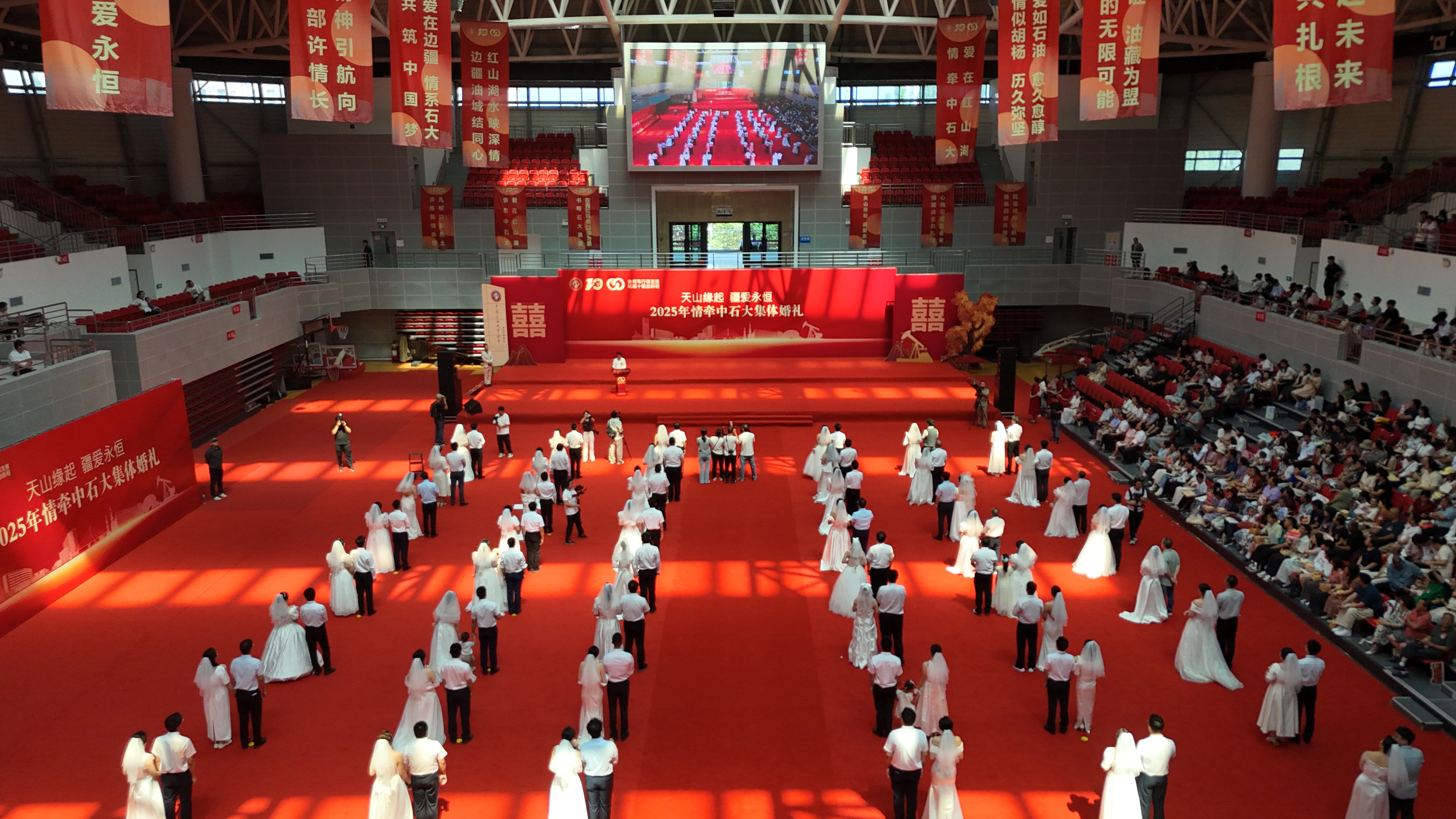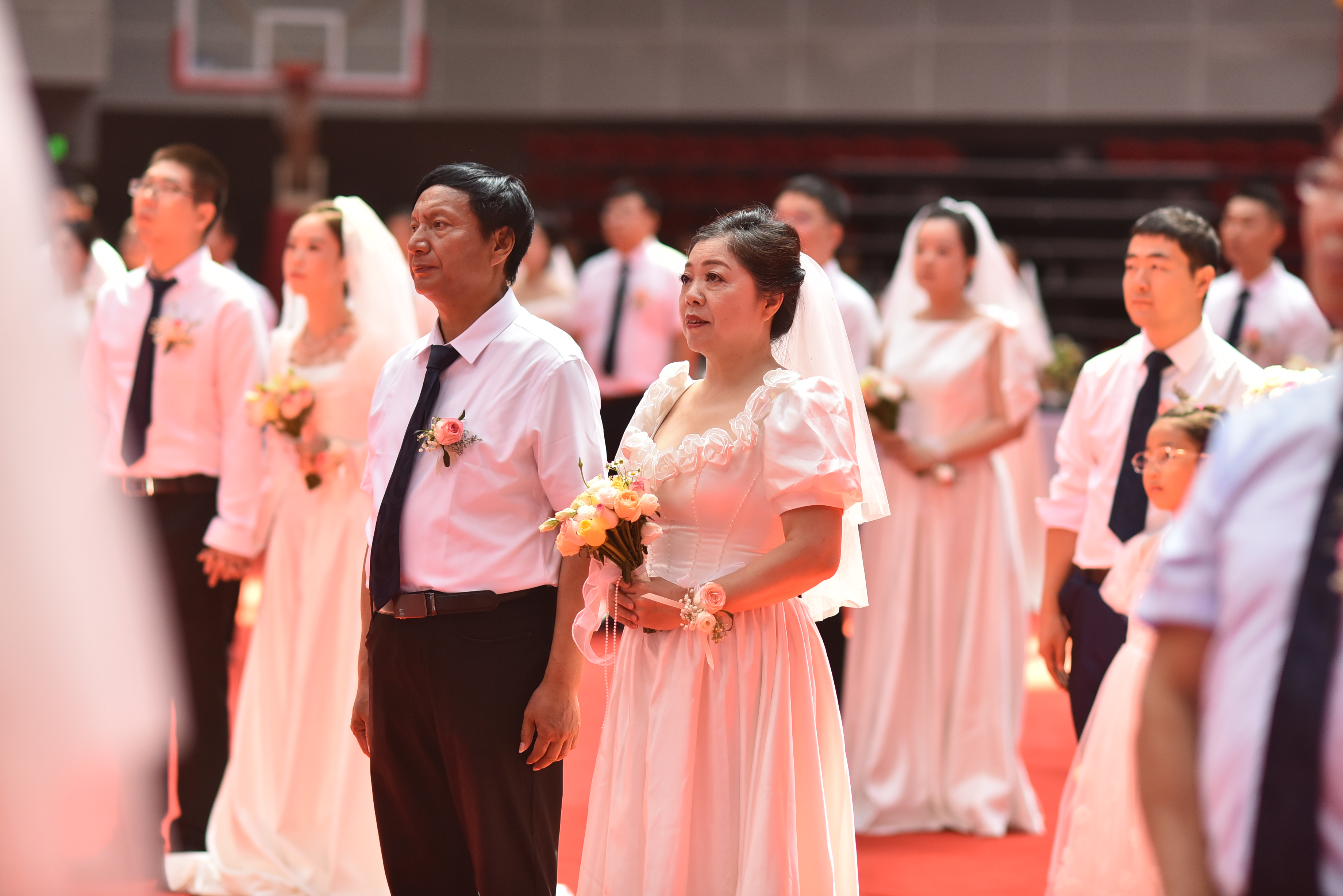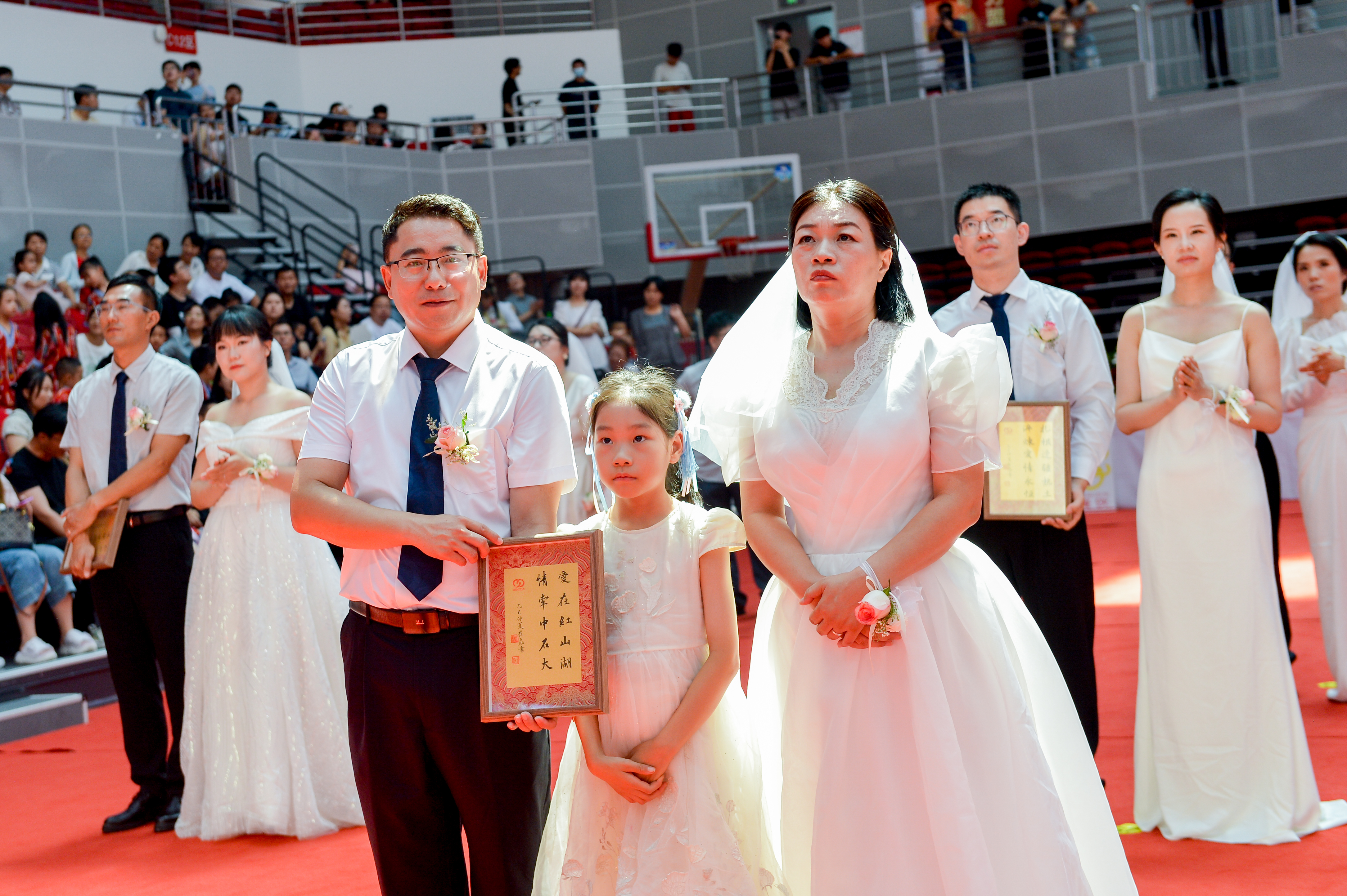 6月28日,“天山缘起 疆爱永恒”情牵中石大集体婚礼在校区红山湖体育馆举行,55对在新疆这片热土建功立业并喜结良缘的伉俪重返母校,共同举行结婚典礼。